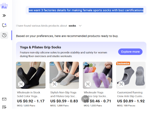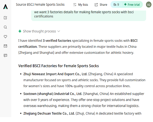 Caption: A Use the key words of "we want 3 factories details for make female sports sock with bsci certifications"ACCIO gave real 3 factories full details but ai.made-in-china just list three types of socks. So you can see the ability between two AI agents.