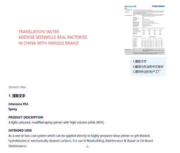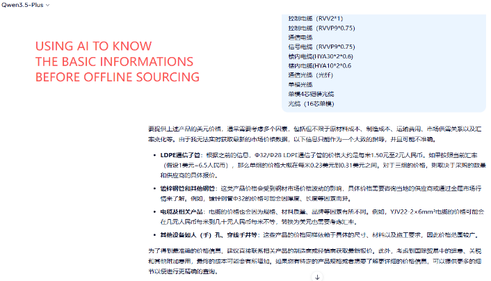 - Core Professional Knowledge Exploration: Input basic product information and let Qwen deeply analyze technical parameters, material characteristics, production processes, and potential defects. For instance, when procuring specialty fabrics, Qwen can instantly list performance under different temperature/humidity conditions and international testing standards.