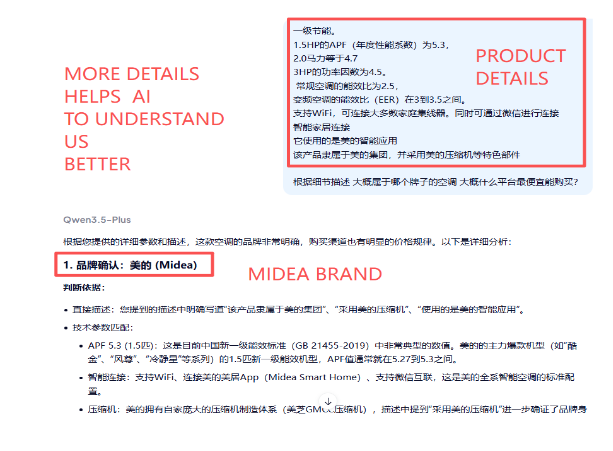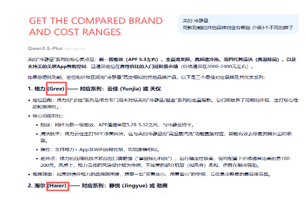 Caption: From client's product details to get right brand MIDEA and go ahead with two more brands' comparing costs GREE & Haier. (donot worry we do the final cost with the original brand supplier, not from AI.)