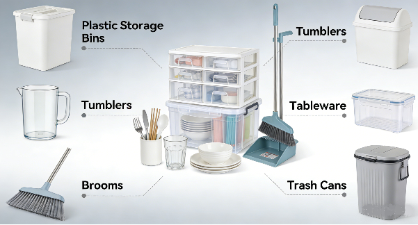 Are you looking to source large quantities of plastic storage bins, tumblers, tableware, brooms, or trash cans?