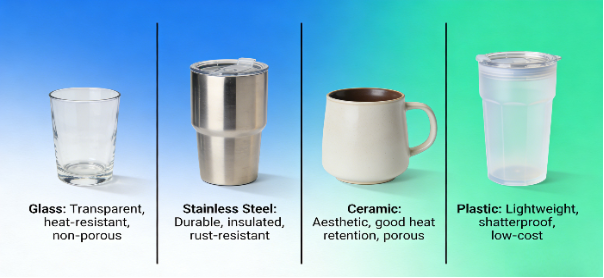 Glass: Glass water bottles are safe and eco-friendly. They don’t retain odors or flavors, making them ideal for water, juices, and other beverages. They are good for both hot and cold liquids and many have protective silicone sleeves.