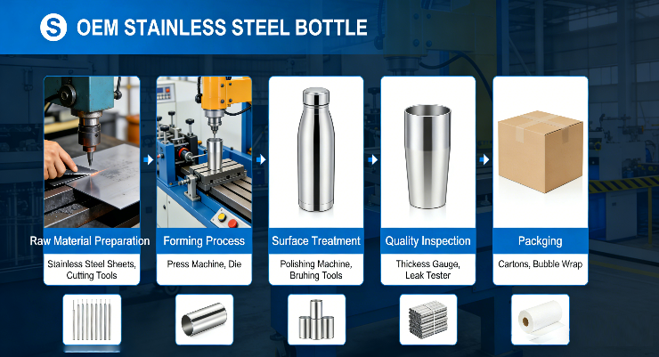 The inner and outer layers of the bottle are manufactured, typically through processes like stainless steel rolling and shaping. The insulating material is prepared according to the design.