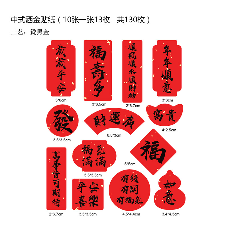 Specifications and models: 10 sheets-chinese gold-sprinkled stickers (130 pieces in total); see picture (logo can be printed)