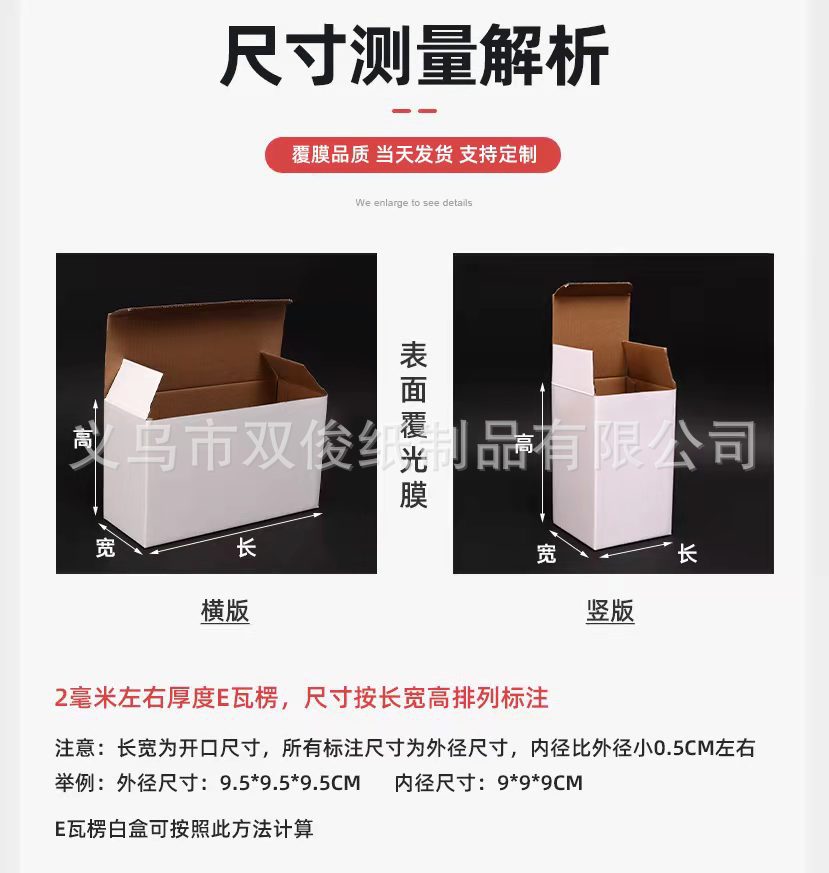 Specifications and models: White bright film; 14.5*8*14; extra hard corrugated