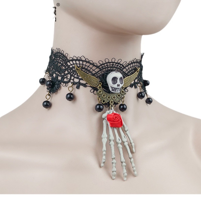 【主要材质】精致涤纶蕾丝 高仿珍珠 树脂骷髅头配件 锌合金电镀古青铜 铁镀银配件 手工制作。