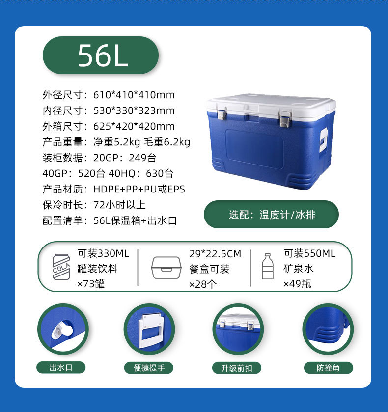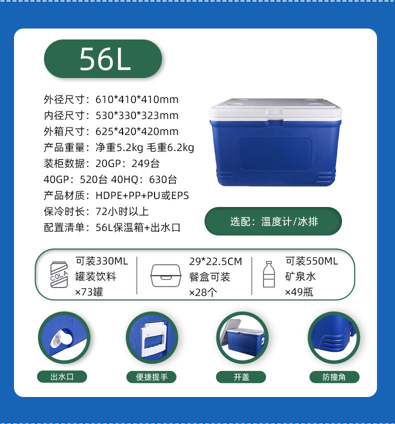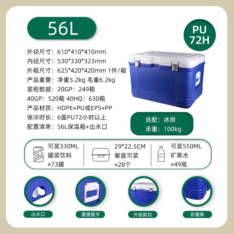 Specifications: [commercial selection] 56l blue cover [high quality pu] keeps cold for 72 hours and comes with water outlet
