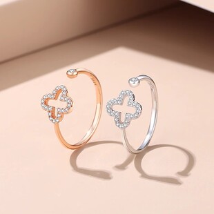 镂空四叶草戒指女小众轻奢锆石花朵食指戒时尚清新可调节开口戒