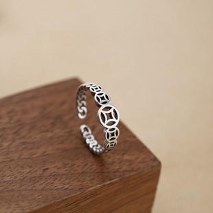 复古铜钱戒指女时尚冷淡风镂空钱币食指戒仿泰银马上有钱开口指环