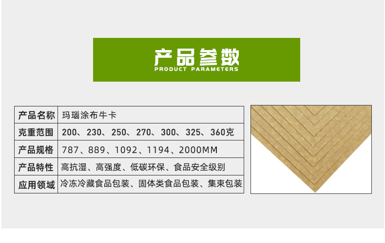 产品特性:拥有优异的挺度盒强度、且涂布面具有优秀的印刷表现力。高抗湿、高强度、低碳环保、食品安全级别、含FSC认证