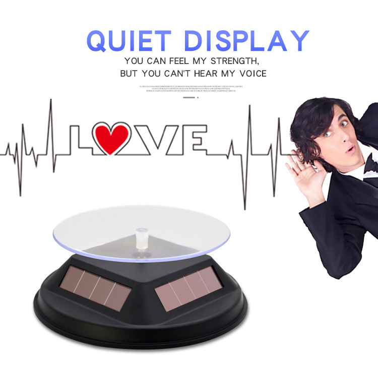 太阳能旋转台,在光线足的地方可用太阳能带动,360度旋转,可顺时针旋转,也可逆时针旋转。方便实用,节能环保,不受时间与光线的限制,是促销展示的好产品。承重量为最大1000g。