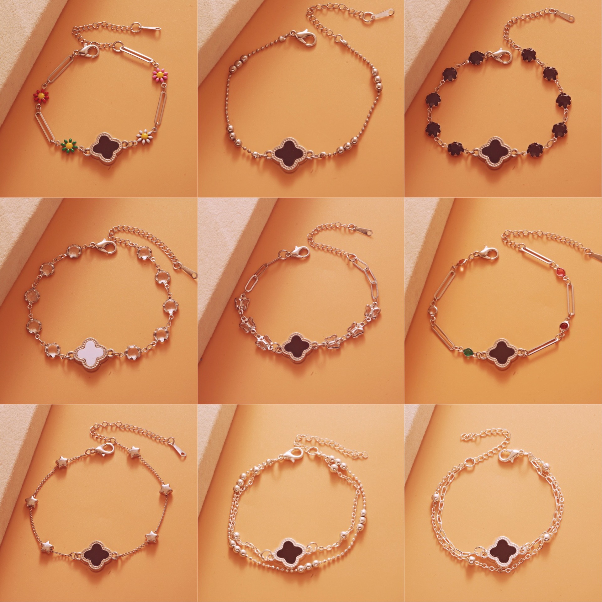 Color: Bright silver black and white five-leaf bracelet