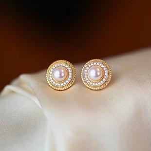 S925银针圆形天然淡水珍珠耳钉时尚轻奢法式复古14k注金简约耳环