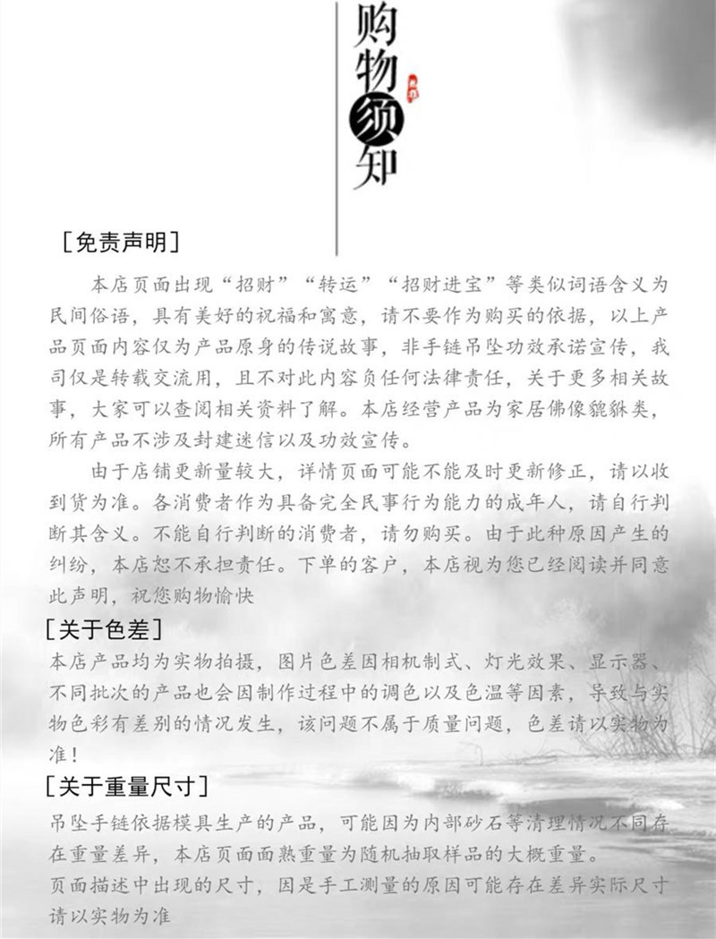 友情提示:部分天然水晶晶体内都具有天然棉絮,冰裂,矿缺 ,和打磨过程中人为造成的硬伤,还有的手链单珠会有微小的大小悬殊.这 就是我们所说的缺憾美。就象喜欢一个人一样,喜欢他(她)就要接受 他(她)的缺点,人无完人,更何况是出自亿万 年前的宝石呢 。请大 家了解天然水晶、爱护天然水晶,希望每一个属于您的水晶都能给您运。