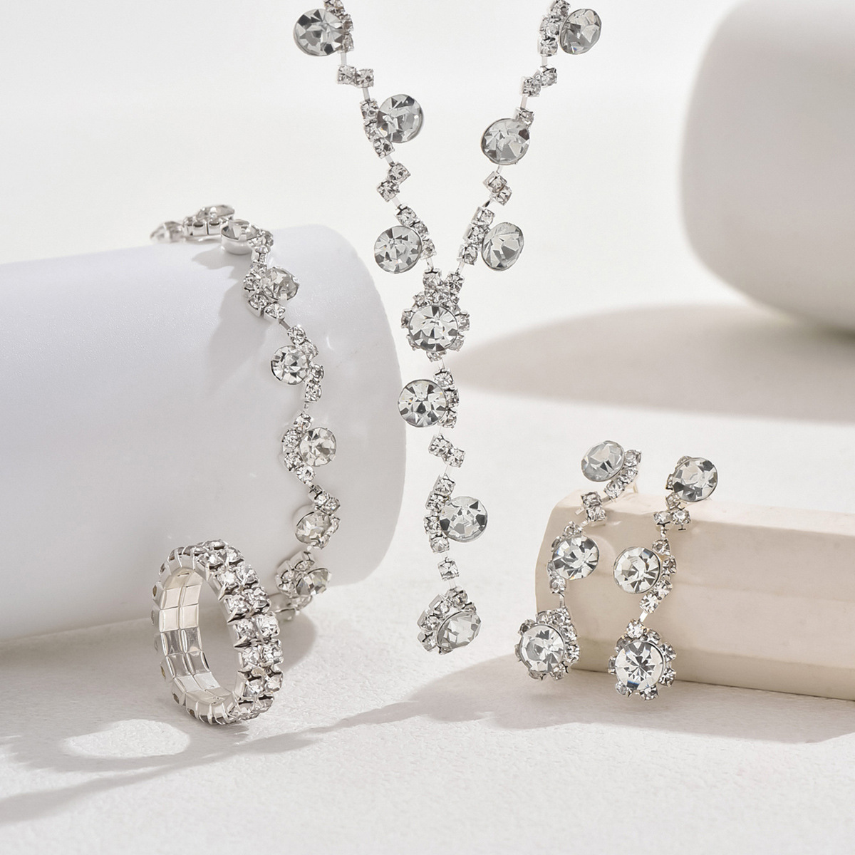 Color: 483747+424-2 silver rhinestone necklace stud earrings bracelet ring