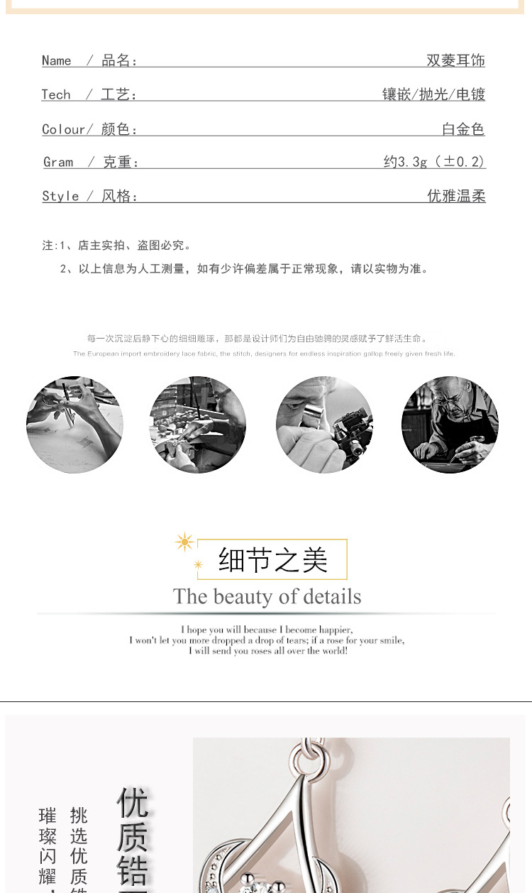 我司饰品材质均采用进口软白铜、铜、银精炼而成。光泽度,进口德国抛光技术,即使切割面精工,一般人也难以分辨。与纯银工艺相比除了价格巨差还同等品质;高品质的电镀白金层,强加厚银,镀保护膜,表面保色,不易褪色,防氧化。在线销售的大多数都是铜材质,质材方面可以定做:925银、990足银,999千足银。详情页的图片均为实拍以上描述的材质仅供参考,但是可以定做。