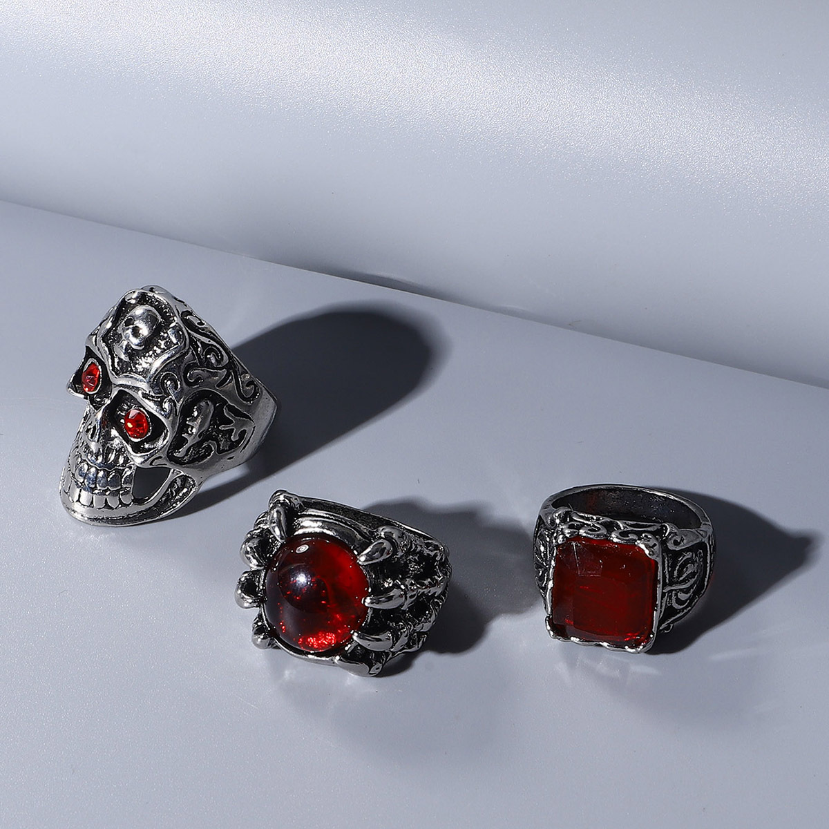 European and American Style Personalized Men's Rings, Alloy Antique Silver Inlaid Ruby Rings, Three-Piece Set of Jewelry
