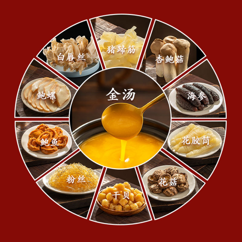 Raw materials and ingredients: Sea cucumber, scallops, abalone, tendons, snail meat, mushrooms, vermicelli, mushrooms, fish maw tubes, white lip silk