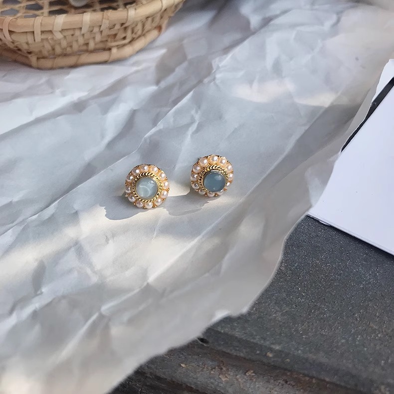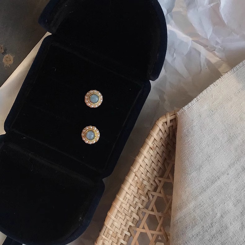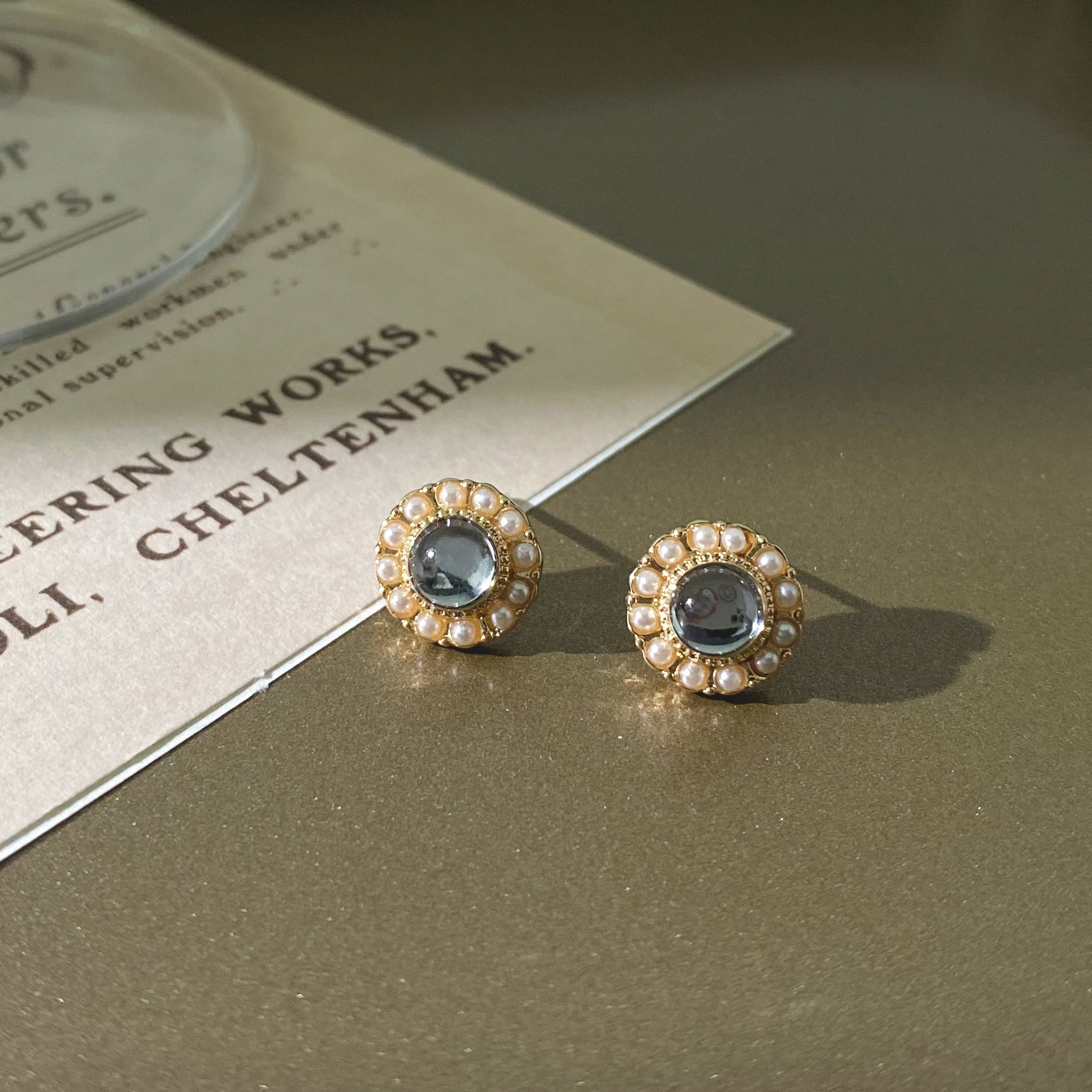 [Light gray blue] original homemade earrings retro elegant ear studs ear clip French court pearl sapphire