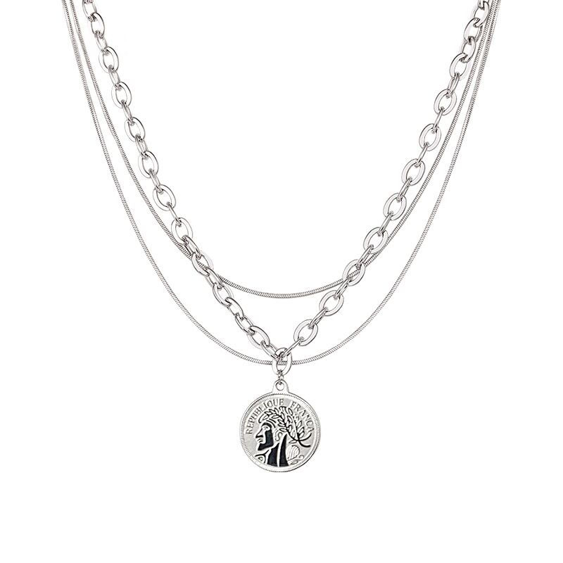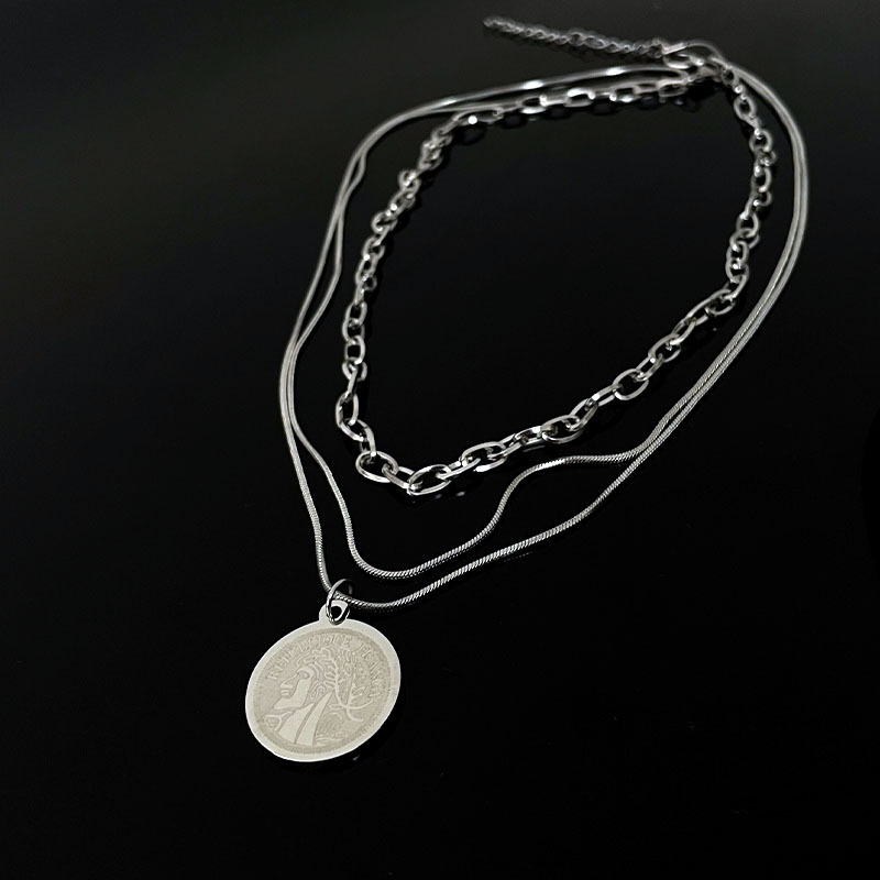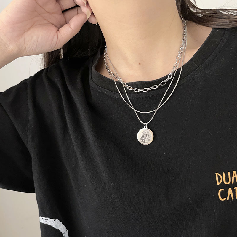 Multi-layer Stacked Round Brand Pendant Titanium Steel Necklace Men's ins Trendy Hip-hop Simple Color-free Collarbone Chain Women's Woolen Chain