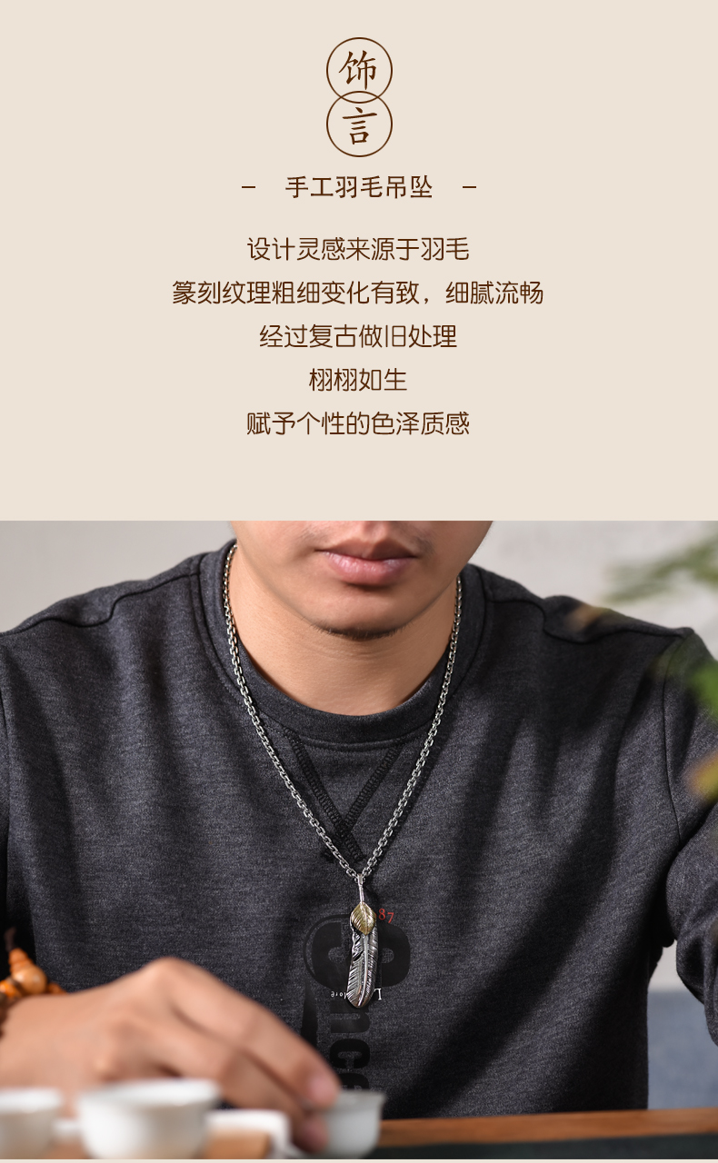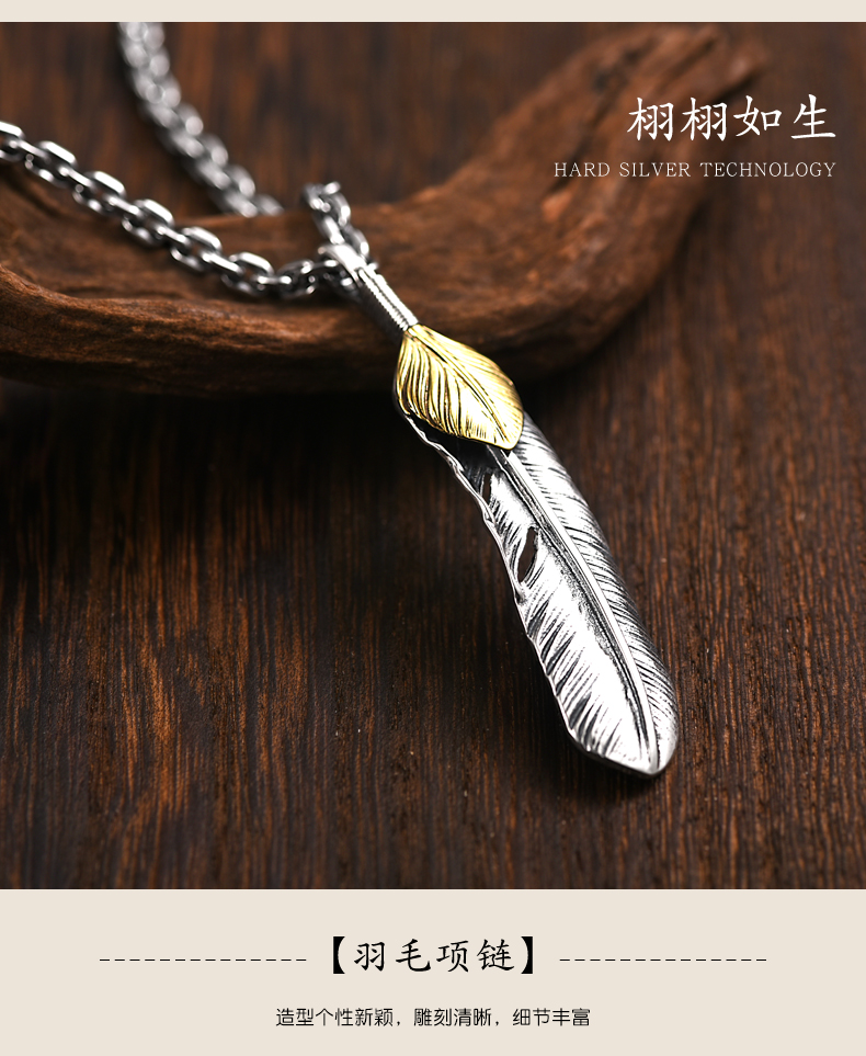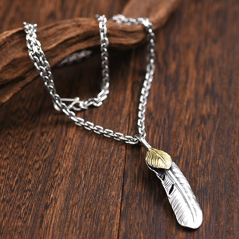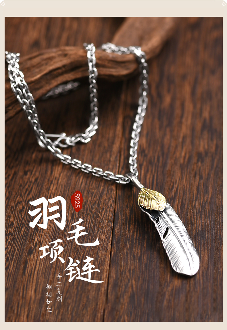 Letter Qin Jewelry 925 Silver Feather Necklace Men's Fashion Brand Retro Hip Hop Couple's Personalized All-match Silver Pendant