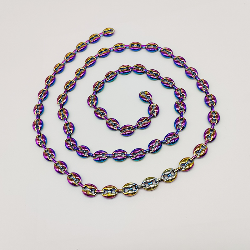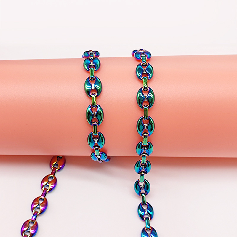 流行元素为金属、拼色、几何、拼接、复古、时尚、个性。链子样式磨链、O字链、方线肥O字、扭链等。