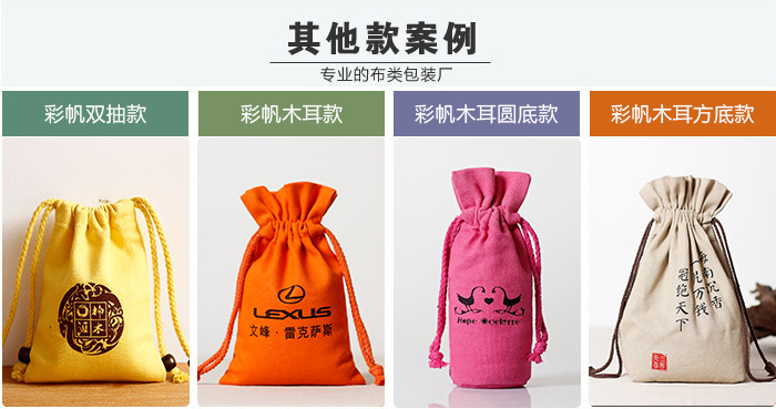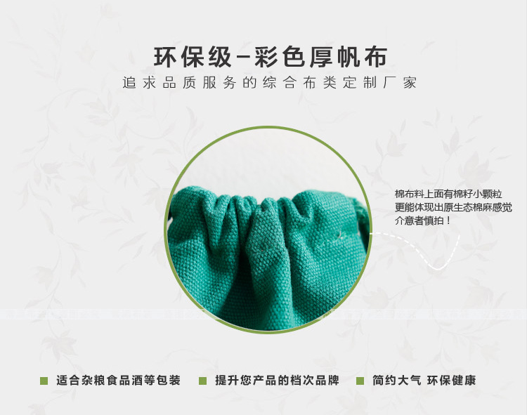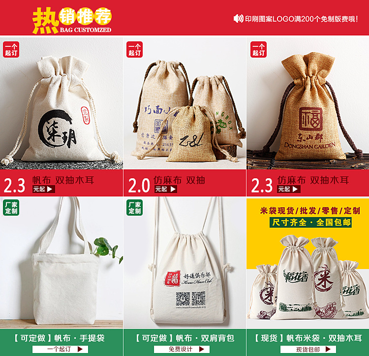 · 二十年精湛生产工艺专业生产:环保束口袋 - 抽绳袋 - 手提袋 - 收纳袋 - 米袋 - 麻袋 - 文玩袋 - 礼品袋等布类包装-- 多种款式可选:有单抽绳袋 - 双抽绳袋 - 双抽绳木耳袋 - 双抽绳圆底布袋 - 双抽绳圆底木耳袋--双抽绳方底木耳袋 - 手提布袋 - 双肩布袋-- 多种优质面料可供选择:棉布 - 帆布 - 麻布 - 仿麻布 - 亚麻布 - 彩色帆布等布料--不论是选材还是工艺,我们都精心设计, 免费为您提供logo,图案等设计服务工厂直销,量大从优,欢迎有需要的顾客咨询。专注布类包装,乐享低碳生活