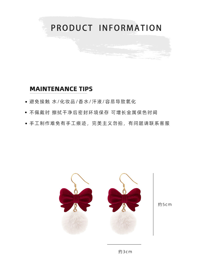 蝴蝶结毛球耳环女酒红色秋冬毛绒耳饰2021年新款甜美无耳洞耳夹