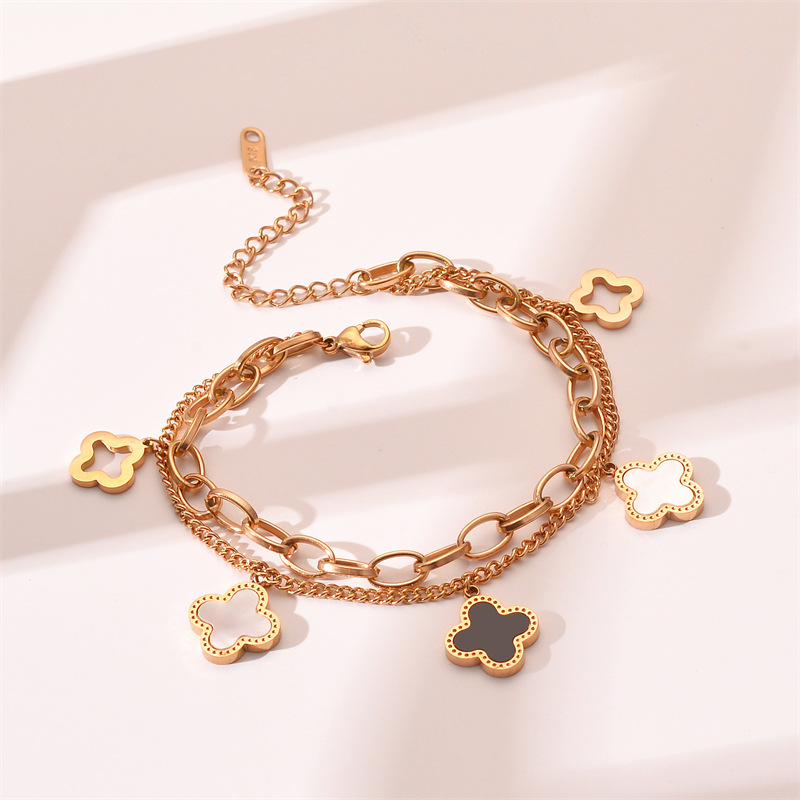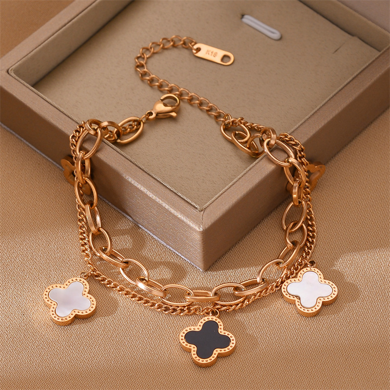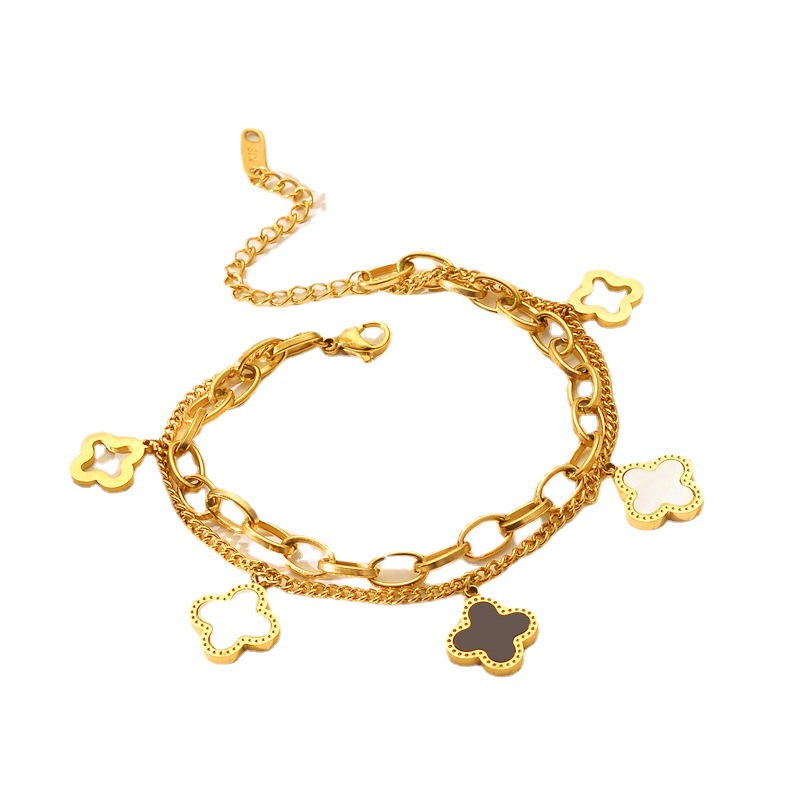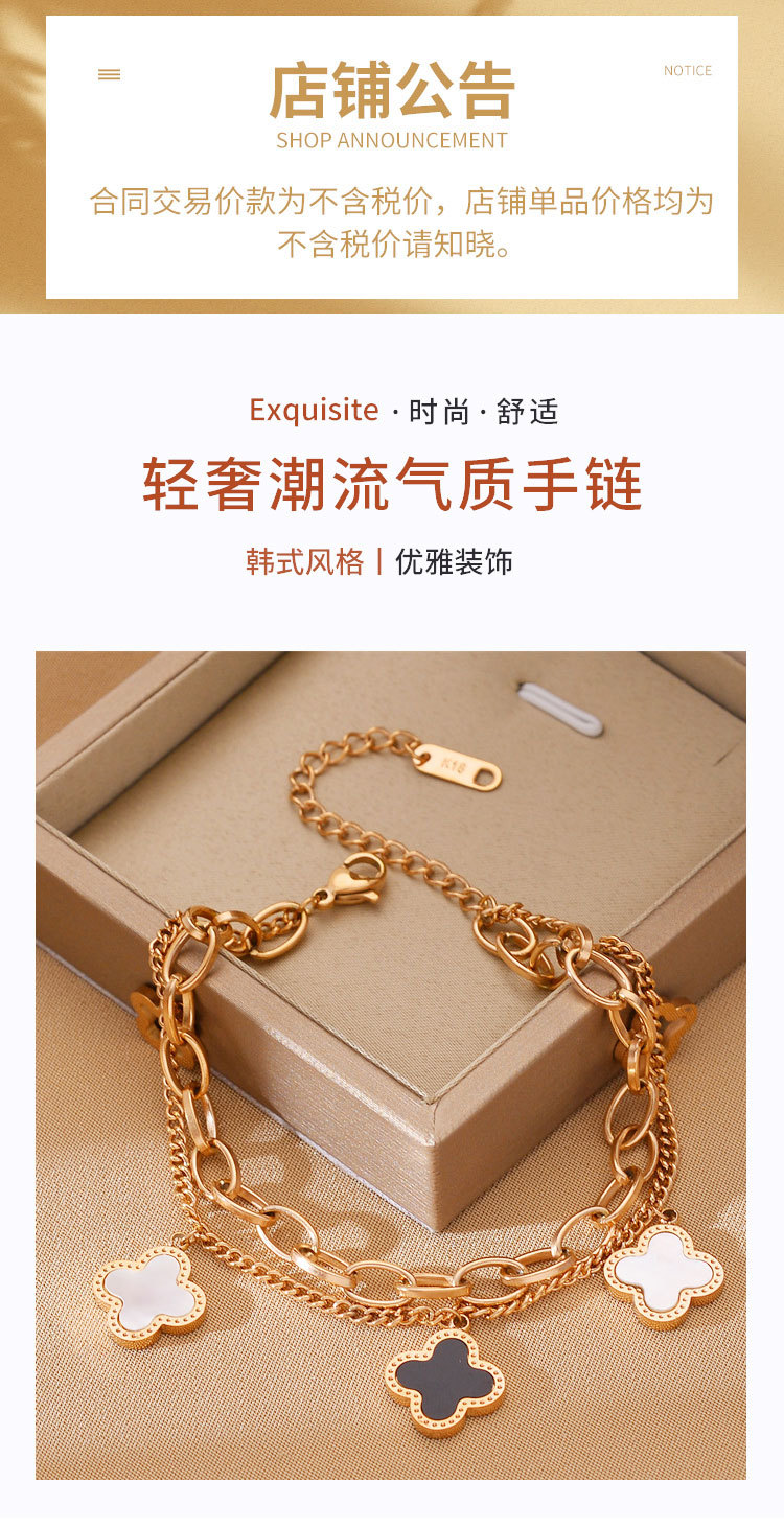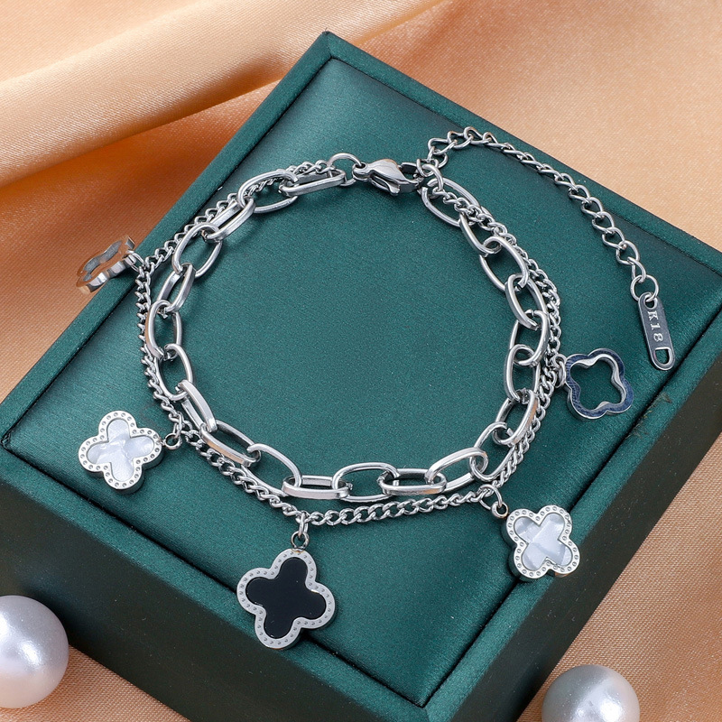 Foreign Trade New Korean Style Titanium Steel Bracelet for Women Four-Leaf Clover Double-Layer Chain Classy Niche Design Non-Fading Hand Jewelry