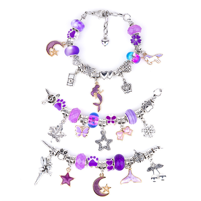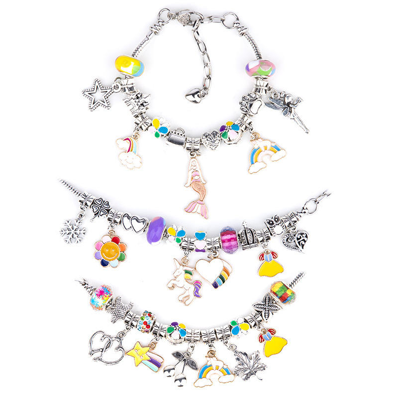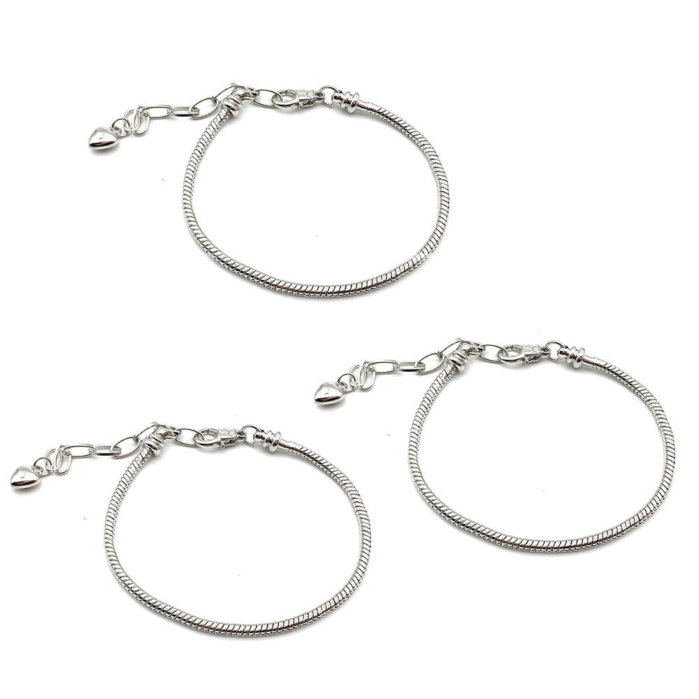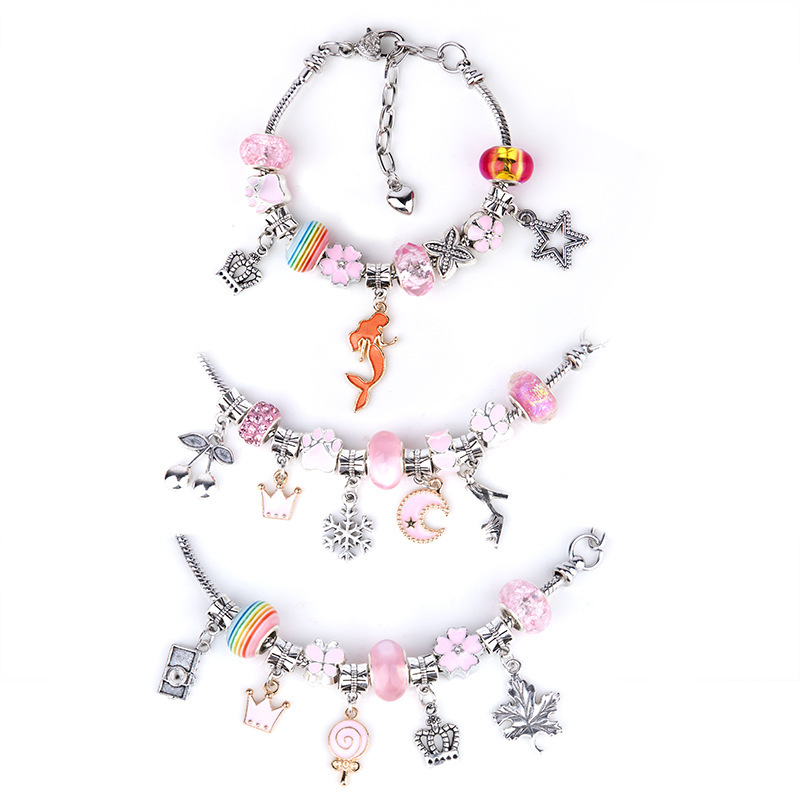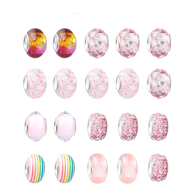 【包装】:粉色手链套件为您提供:3条蛇骨手链,带有心形龙虾扣延长链,20个吊坠,20个合金大孔珠,20个粉色系列琉璃珠,足以让您DIY您的自己的珠宝工艺。