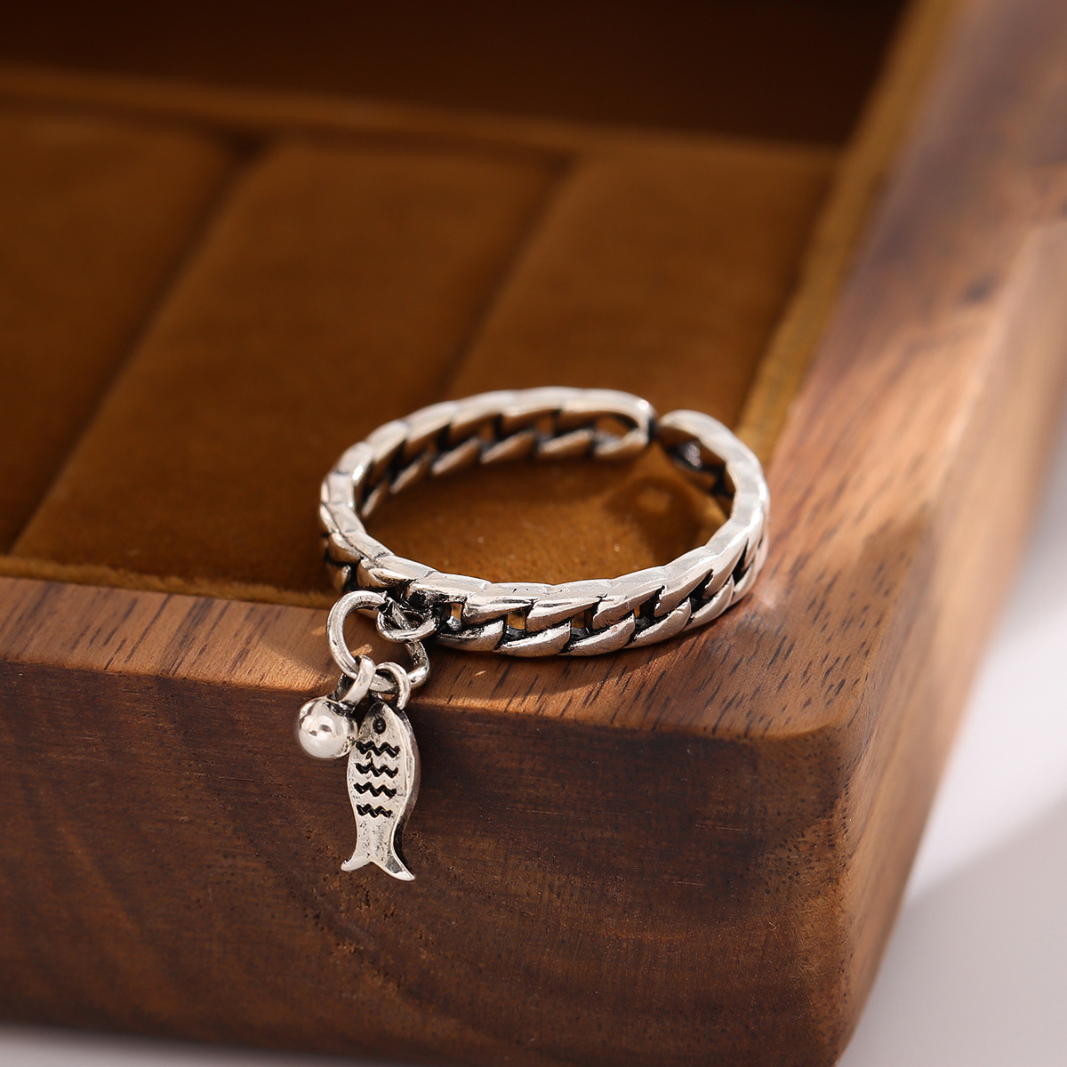 Creative Retro Old Hollow Chain Light Beads Small Fish Personalized Open Ring for Women