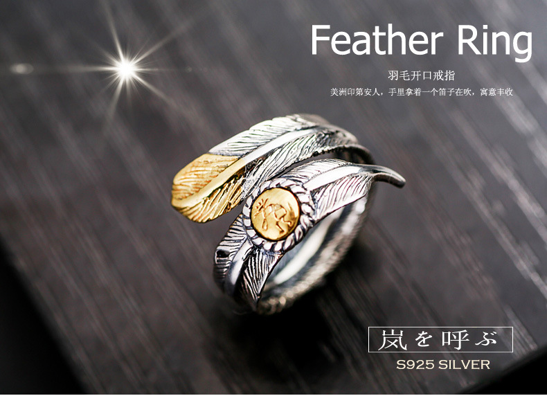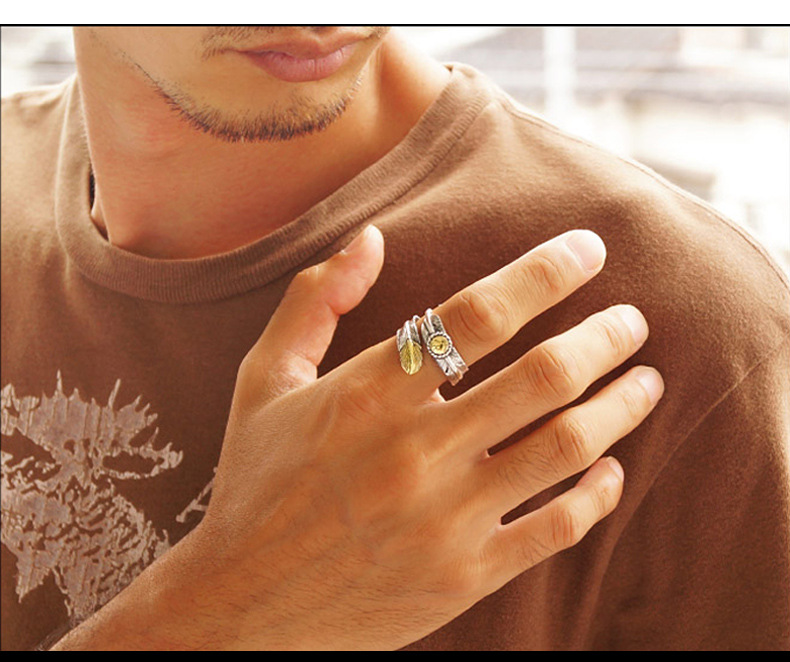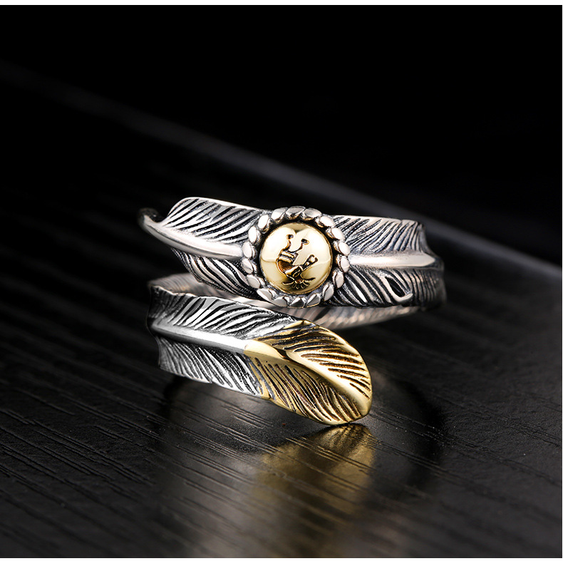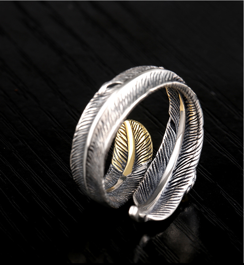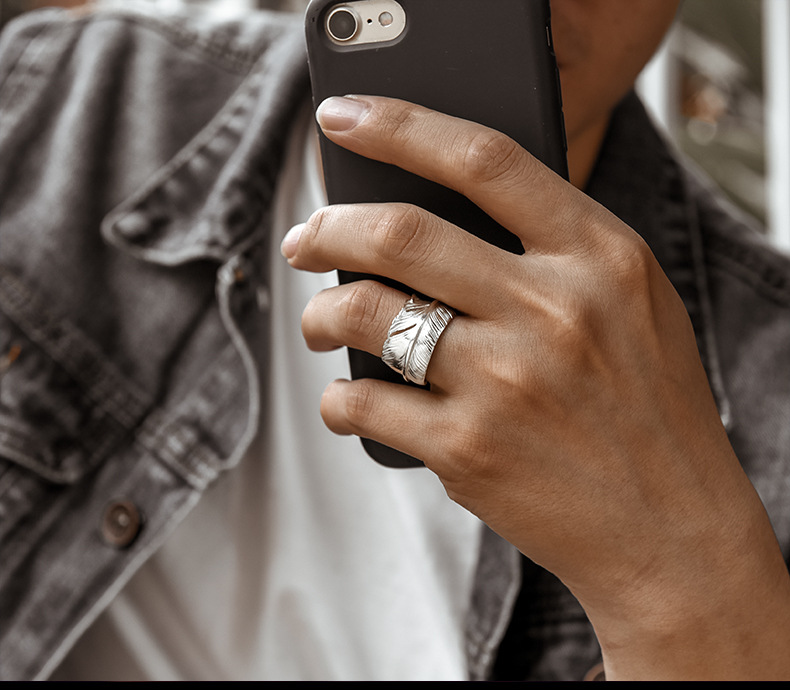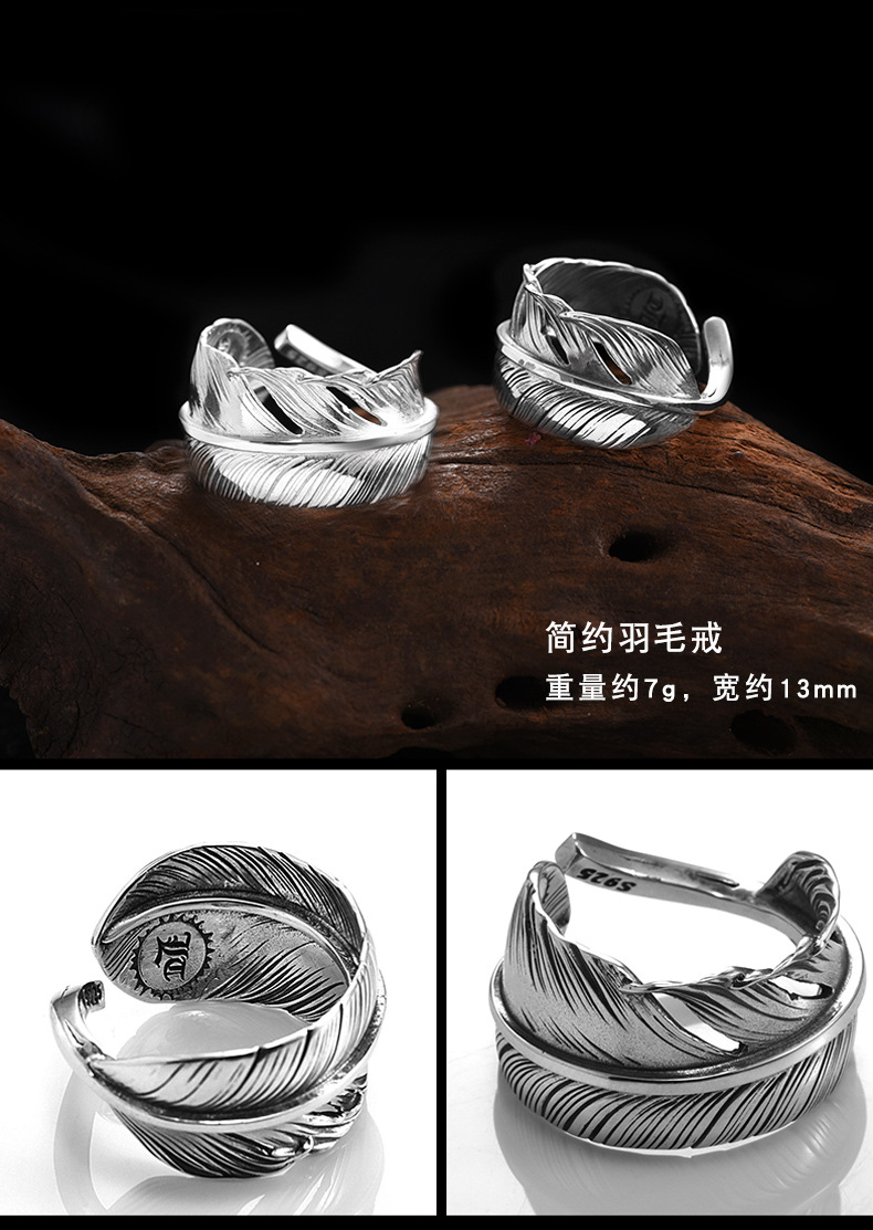Niche design retro internet celebrity single ring trendy men's open feather silver ring Women's adjustable hip hop personality silver jewelry