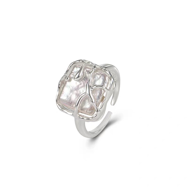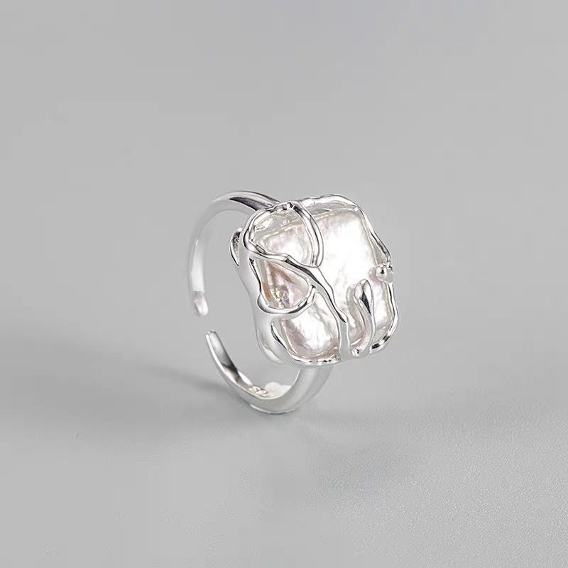 S925 Sterling Silver Texture Shaped Branch Ring Women's Baroque Pearl Finger Ring Light Luxury High All-match Designer Style