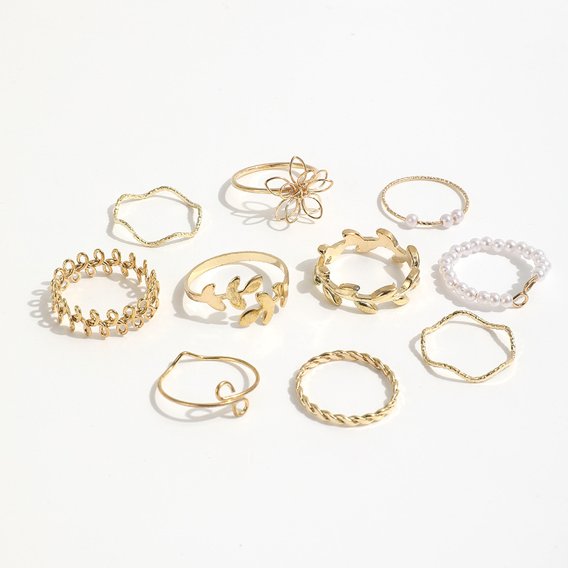 Outer Bohemian Style Hollow Flower Set Ring Simple Gloss Leaf Vine Imitation Pearl Ring 10-piece Set