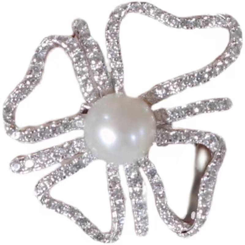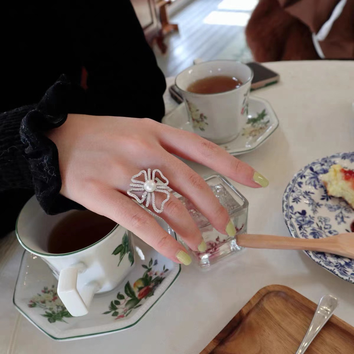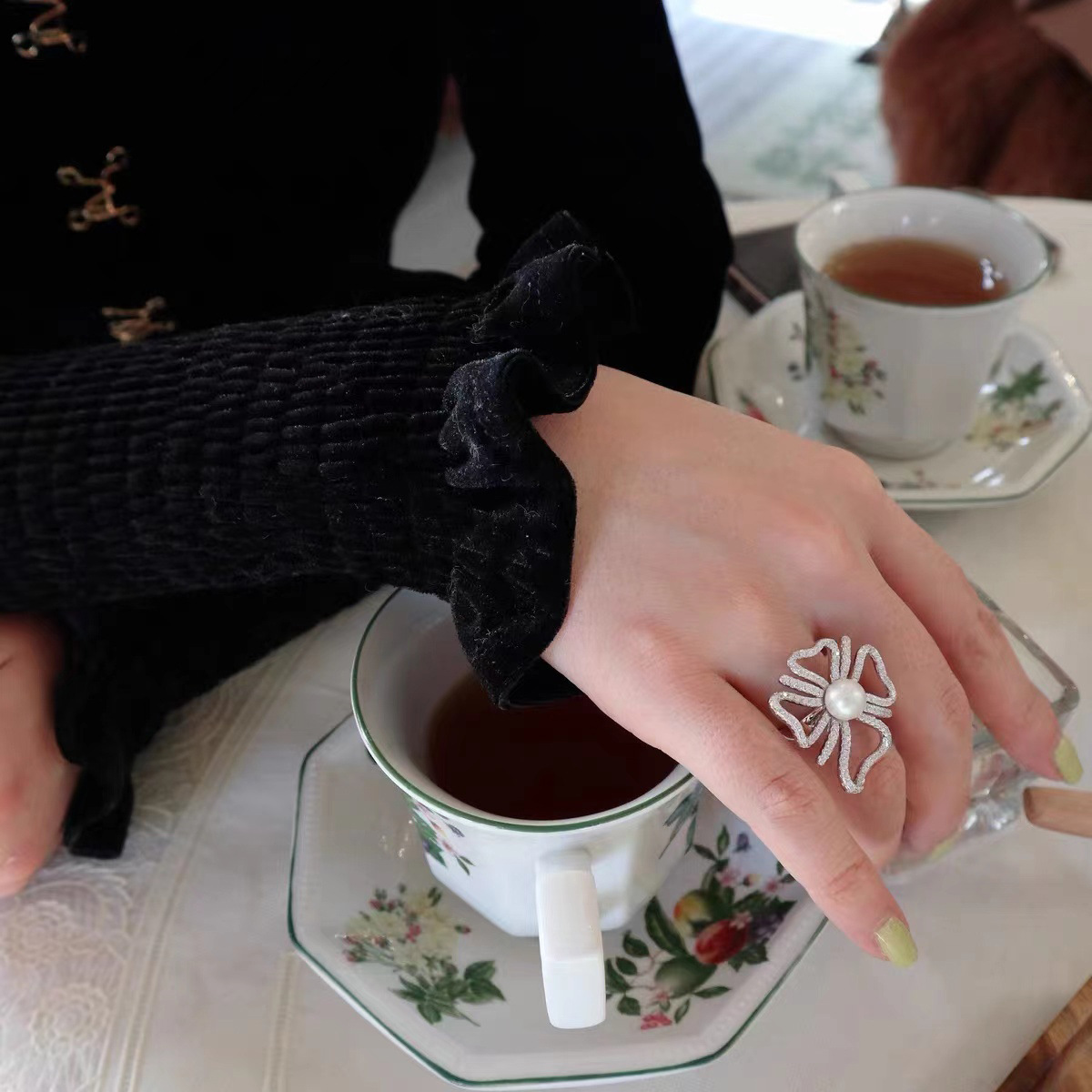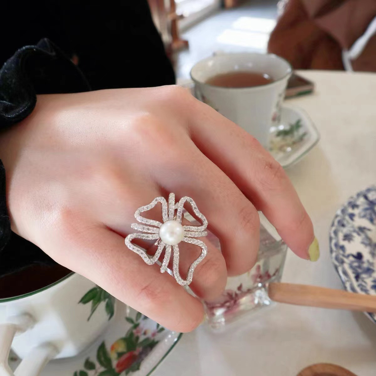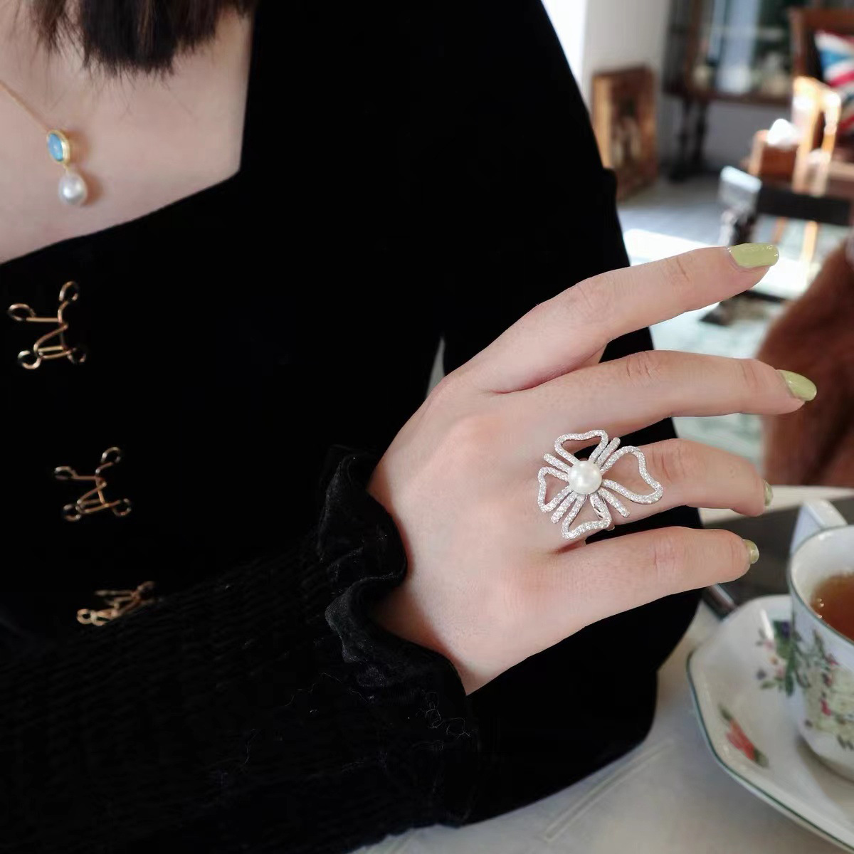 Light Luxury Elegant White Moonlight Goddess Hollow Pearl Ring Women's Flower Jewelry High-end Sweet Niche Design