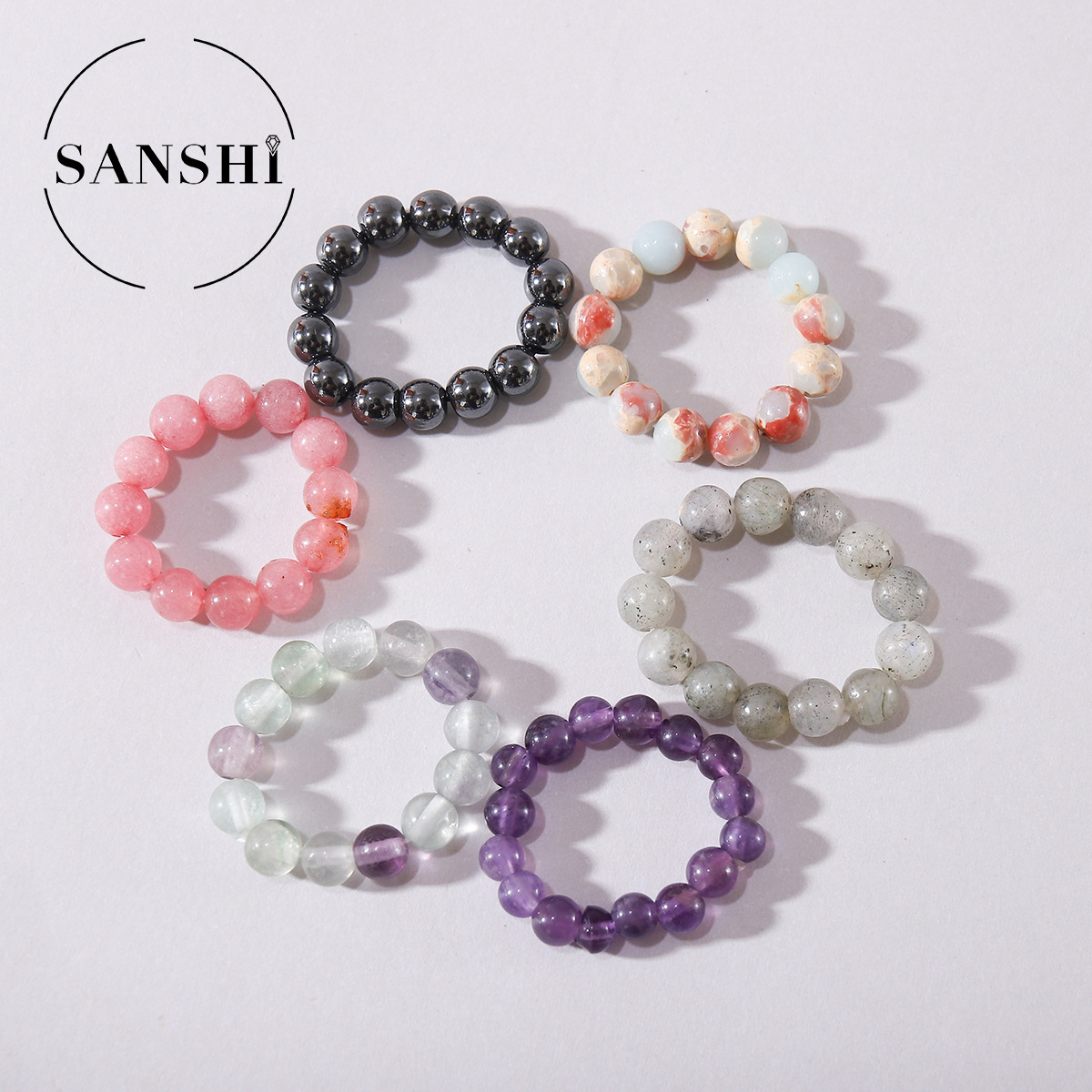 戒指的材质是天然石和水晶,弹力绳可调节