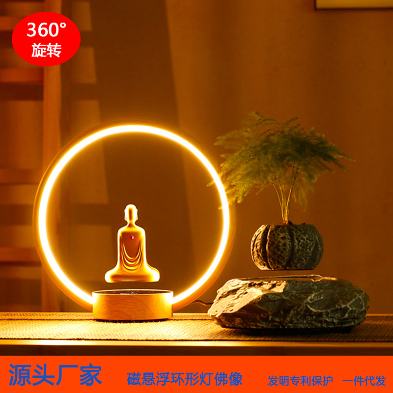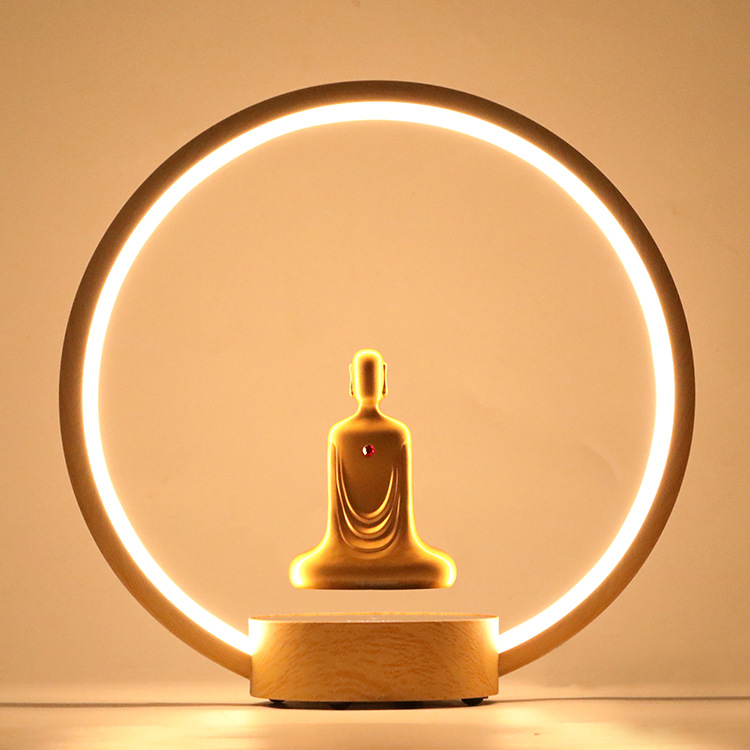 Magnetic levitation gold-plated faceless Buddha statue rotation LED luminous ring table lamp Zen meditation Buddha statue ornaments