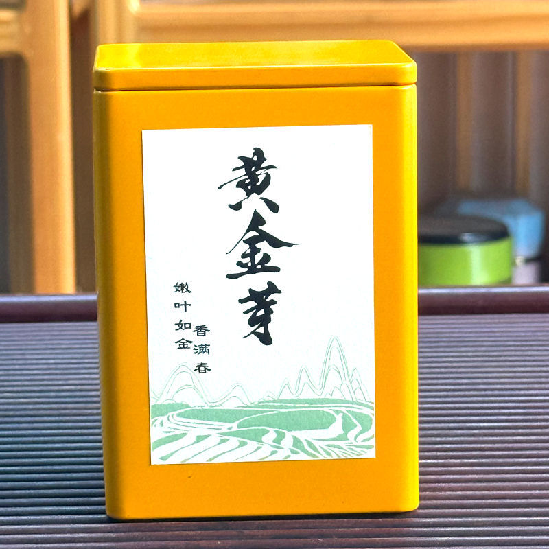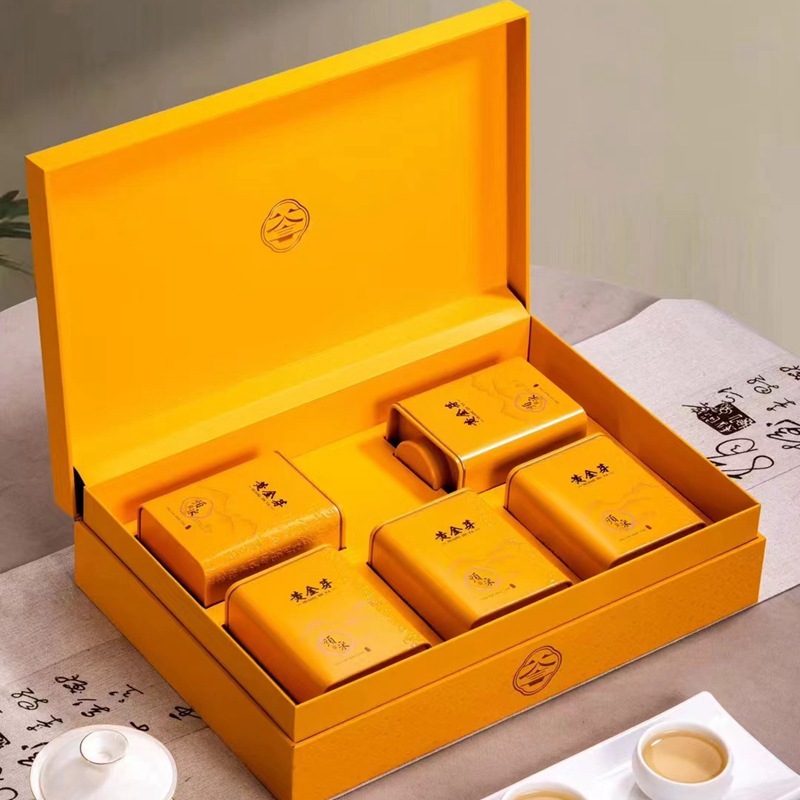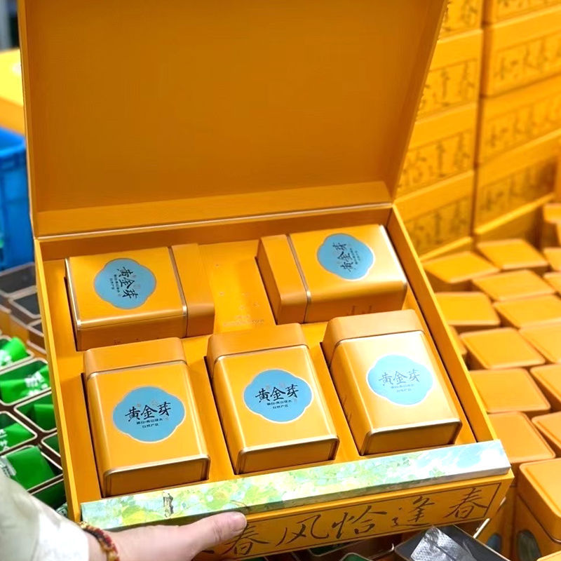 这款礼盒内配置5个小铁盒配一个手提袋,重量:250克,内装明前黄金芽,板栗香,口感醇厚,甘甜爽口。
