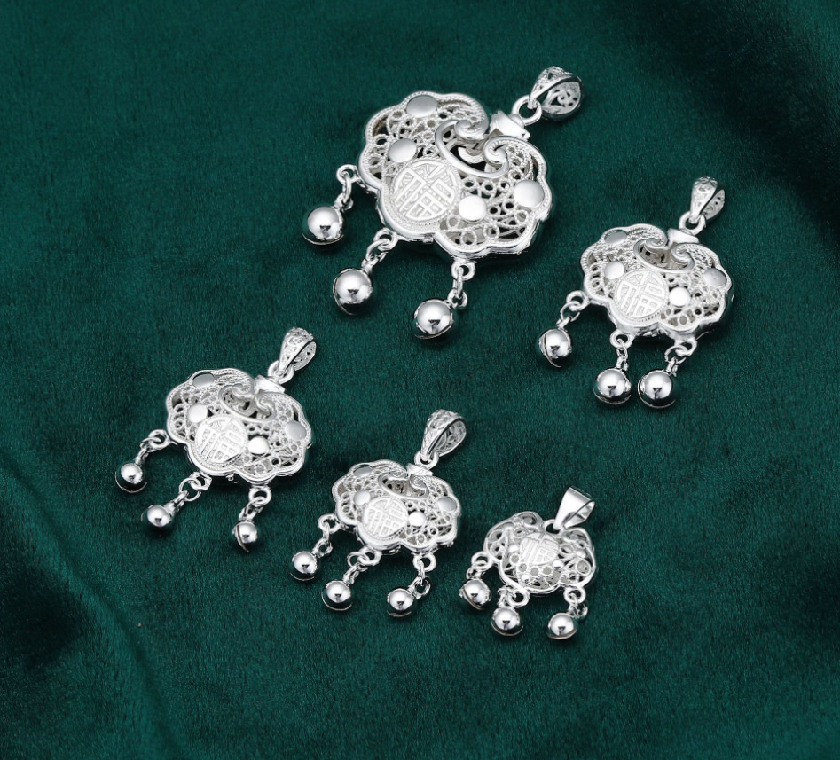 定银饰的一些方法(举例): 1.钢印:银首饰一般应打上银的英文缩写(“S”或“Sterling”)的印记。标准银的印记是S925。足银的印记是S990。但也有许多国家在银首饰上不打印记。 2.色泽(这里指的是银饰的原色):银首饰多呈微带黄的银白色,呈柔和的金属光泽。因易氧化,时间久了,色泽会变成暗的黄白色。 3.掂重:银的密度为 10.53克/立方厘米。比铂金、黄金小,用手掂无坠手感。钢针可以划出痕迹,也可以折弯。用这种方法可以和铂主、K白金或仿银的德银首饰相区别 4.试酸:银遇任何酸都会变色,甚至溶解。如果在银首饰的内侧滴上一滴浓盐酸,会立即生成白色苔藓状的氯化银沉淀而其它贵金属则无此现象。 5.声音:银首饰落地后声音沉闷,不弹跳,不滚动。
