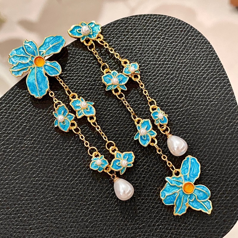 Color: 2508096 blue flower pearl tassel asymmetric earrings (s925 silver needle)