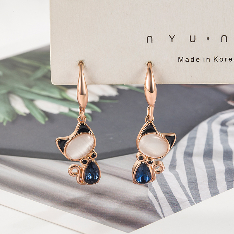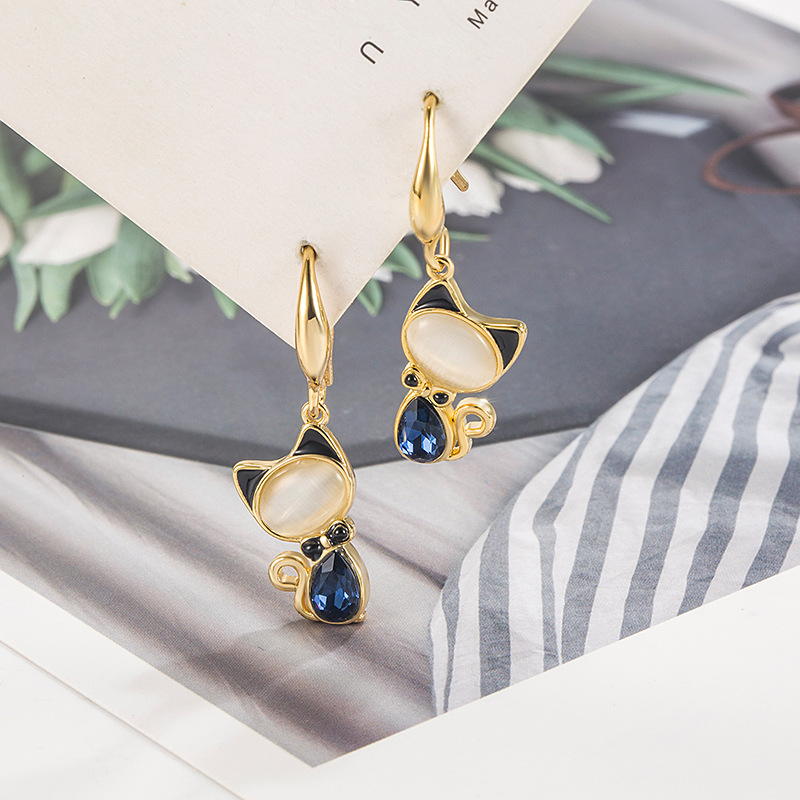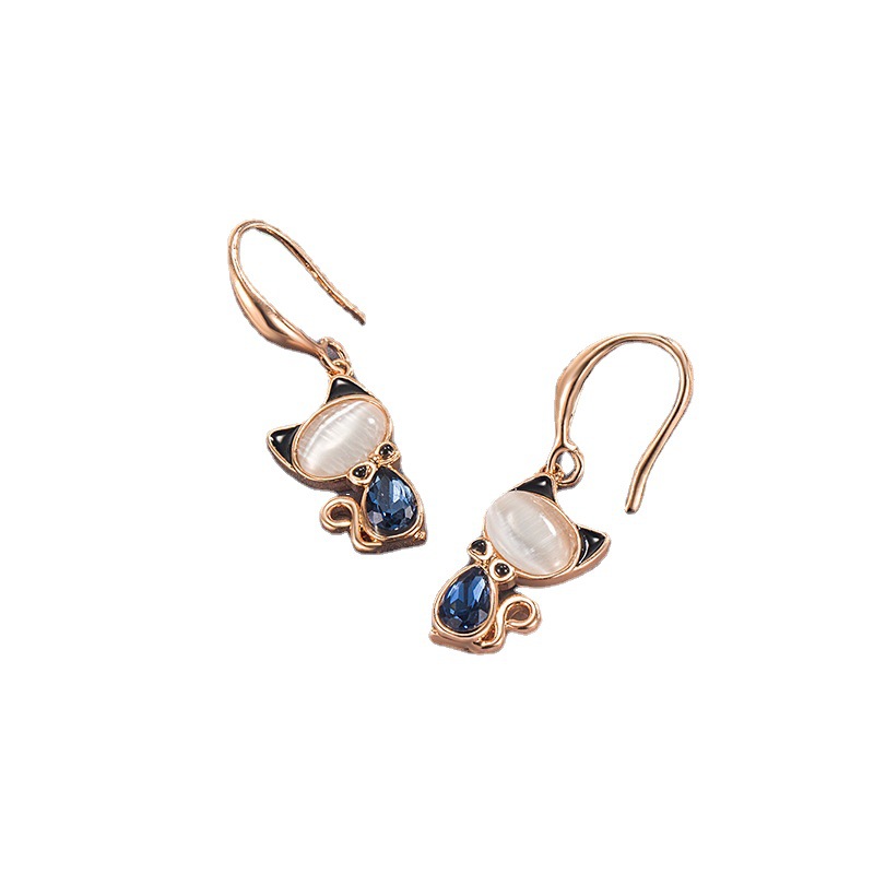 Cat's eye stone blue crystal kitten earrings women's Japanese and Korean cute sweet temperament earrings High sense ear hook earrings