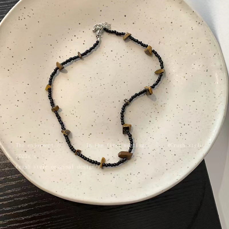 New Chinese style natural stone beaded necklace women's black braided rope vintage clavicle chain fashionable temperament design necklace