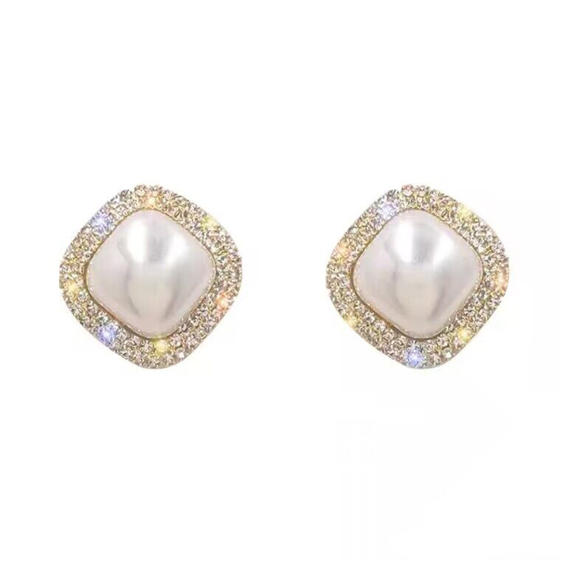 Fashion high-grade square double-layer rhinestone edge imitation pearl stud earrings female niche design geometric square earrings
