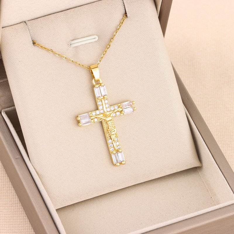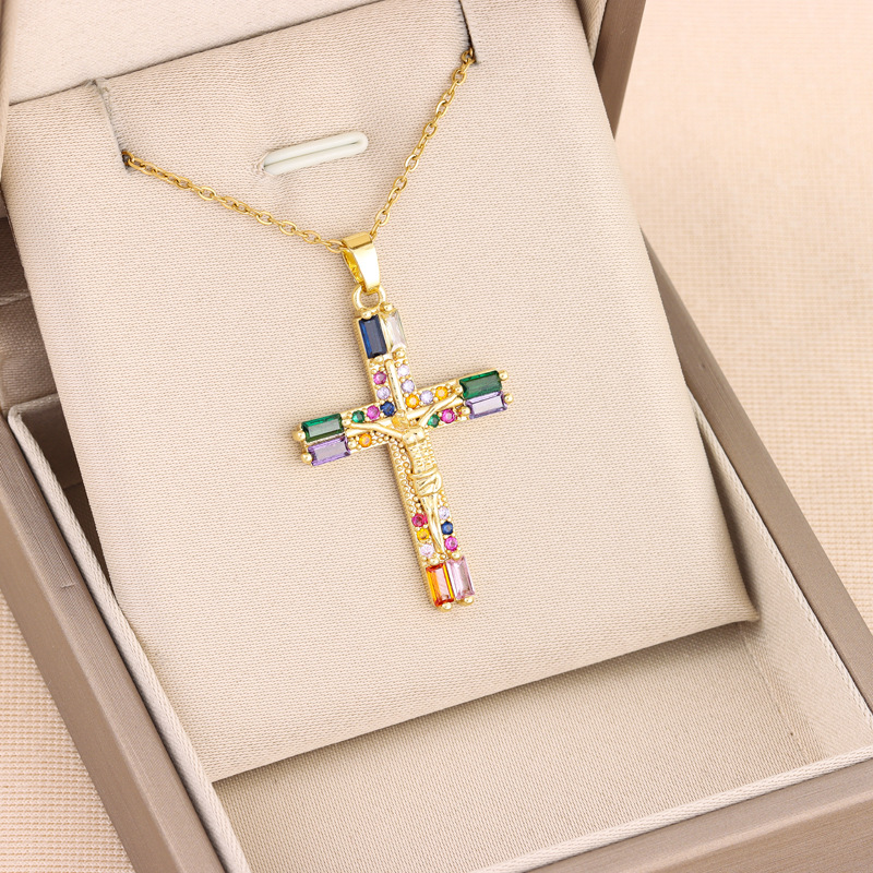 Cross-border New Retro Bohemian Style Color Zirconium Cross Titanium Steel Necklace Trendy Women's Stainless Steel Necklace