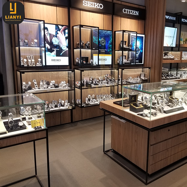 Shop Wrist Watch Glass Counter Display Case with Light Custom Wooden Glass Iron Frame Display Case Jewelry Watch Showcase