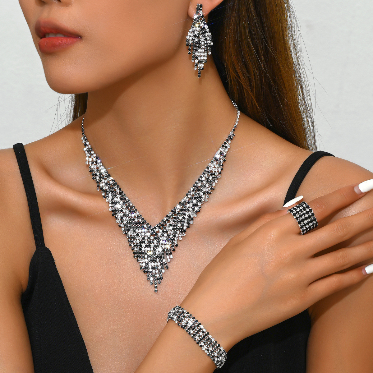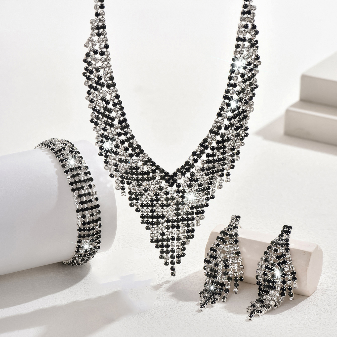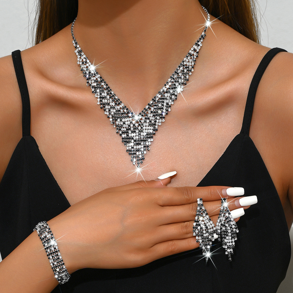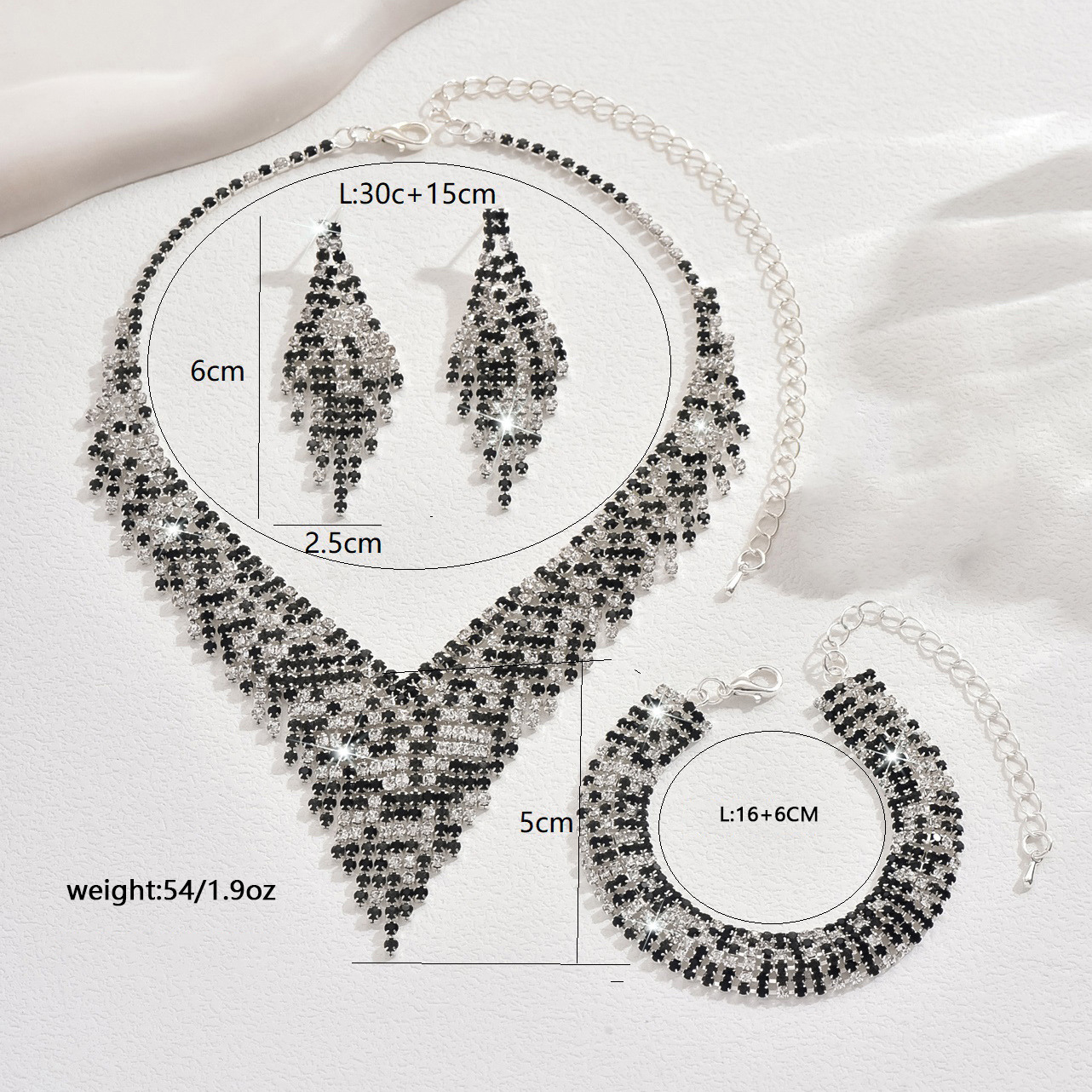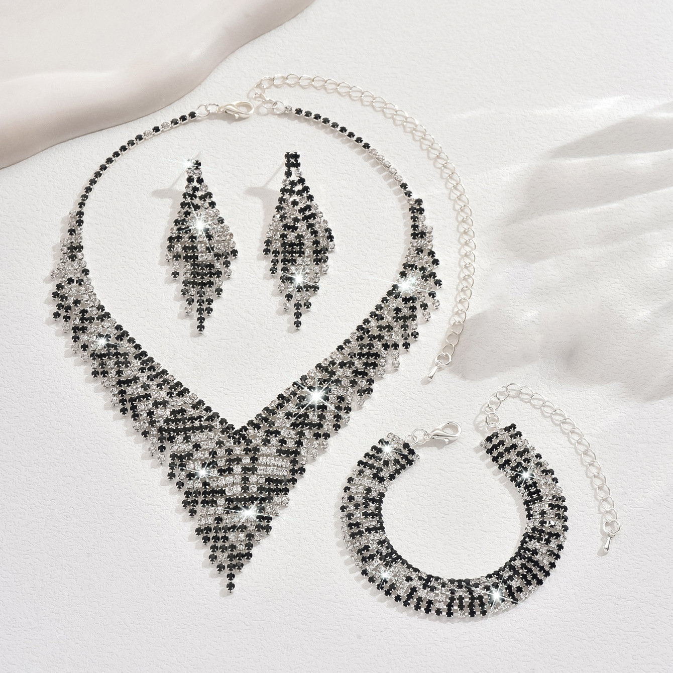 Color: 718b9005 black and white diamond electroplated silver necklace + earrings + bracelet