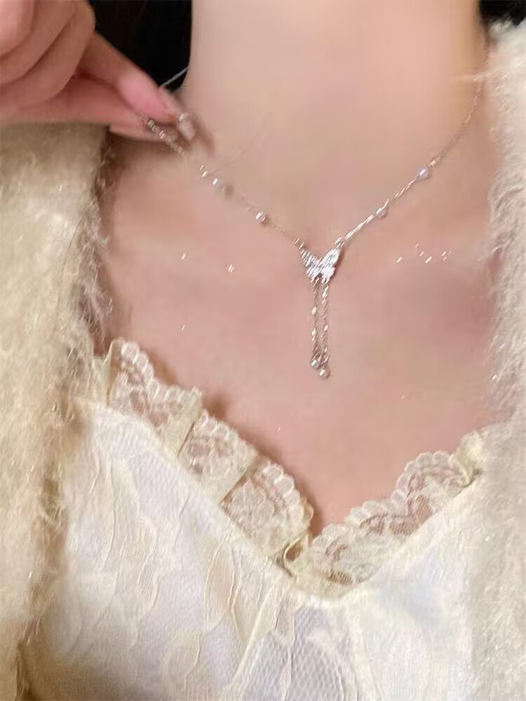 Cross-border New Creative ins Necklace Niche European and American Simple Design Sense Light Luxury Butterfly Pearl Necklace Clavicle Chain