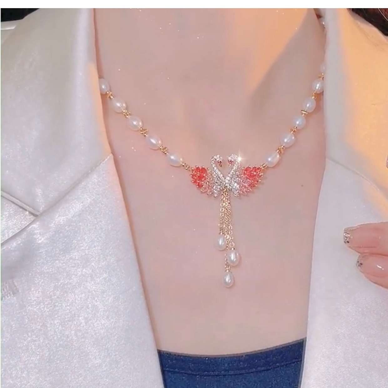 Color: Pink swan white pearl necklace [real gold plating]