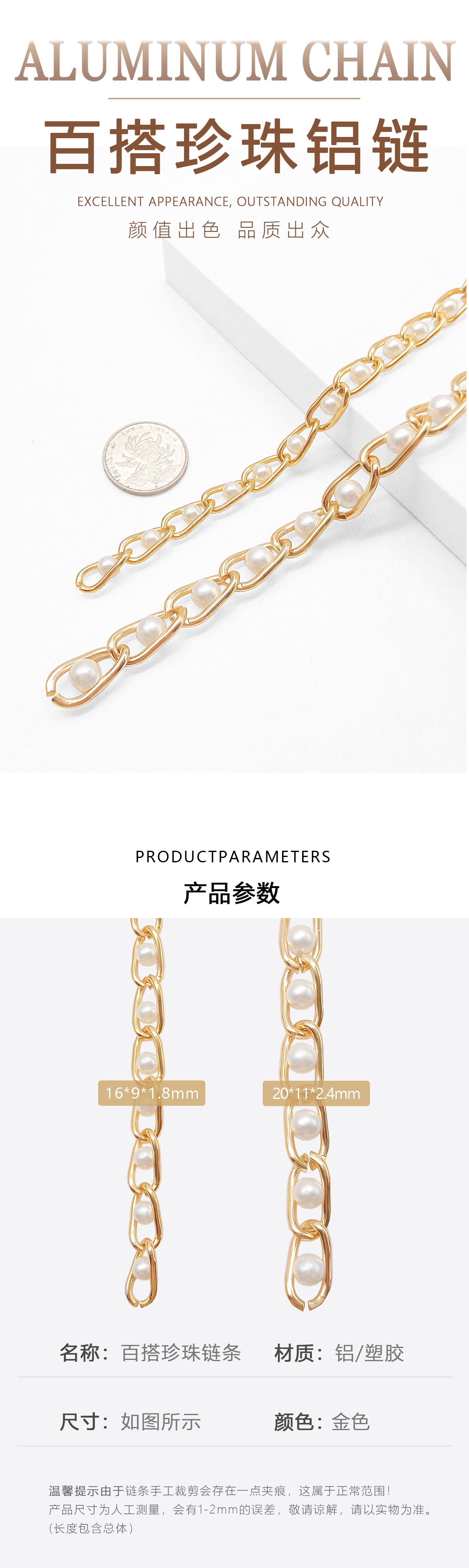 Color: 1.6x 9x 16mm gold beaded aluminum chain