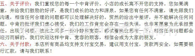 收到商品后如有什么疑问或不满意的地方,不要急于评价,一定要及时和我沟通,我会尽力做到让您满意的,您的好评对我非常重要,更重要的是让您满意,谢谢。请相信我会是您最值得信赖的卖家.