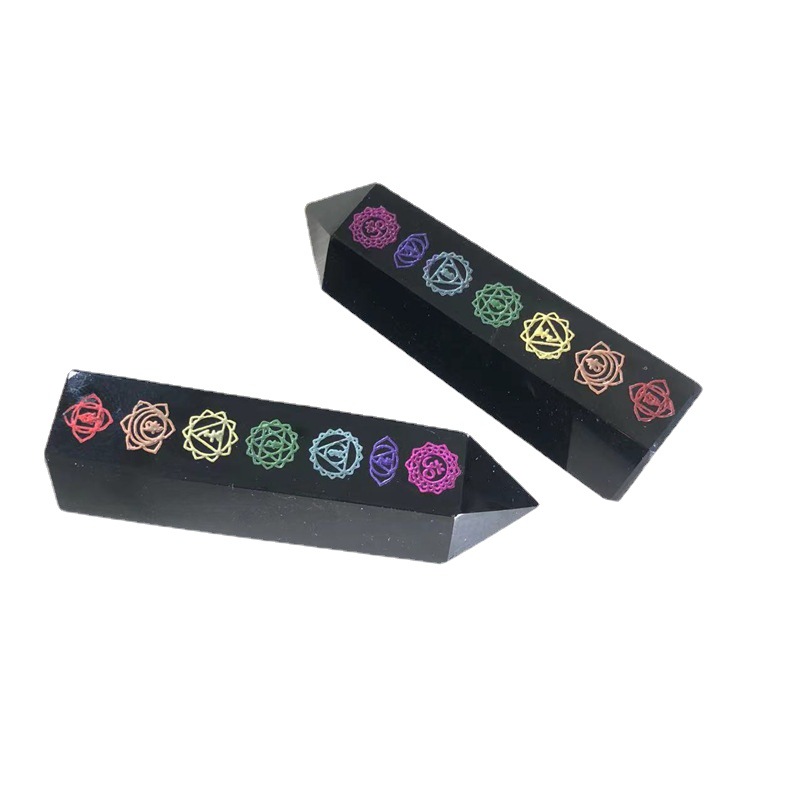 天然黑曜石雕刻七色轮柱欧美跨境专供冥想单尖六棱柱装饰摆件批发